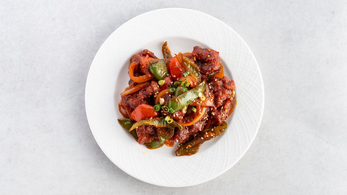鶏肉と野菜をチリソースで炒めた、刺激的な辛さが特徴の料理です。辛いものが好きな方におすすめです。/ A dish characterized by its stimulating spiciness, stir-fried chicken and vegetables with chili sauce. Recommended for those who love spicy food.