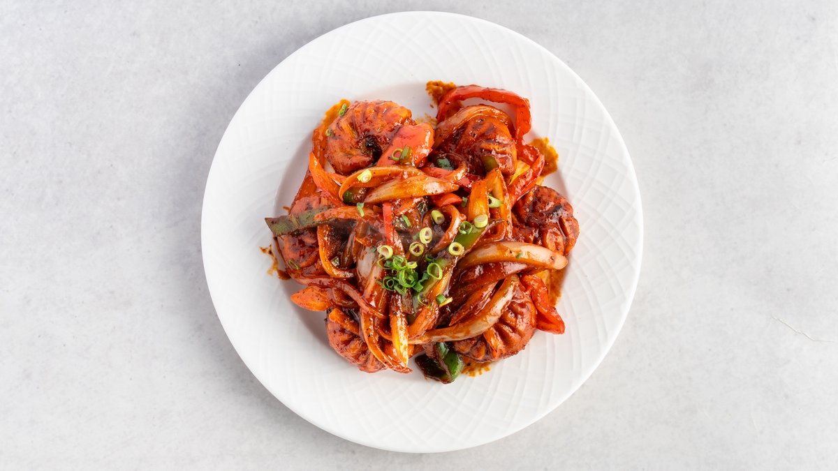 餃子のようなモモを揚げ、特製のチリソースで炒めたスパイシーな一品です。ピリッとした辛さが食欲をそそります。/ A spicy dish of fried momo (dumplings) stir-fried in a special chili sauce. The mild heat stimulates the appetite.