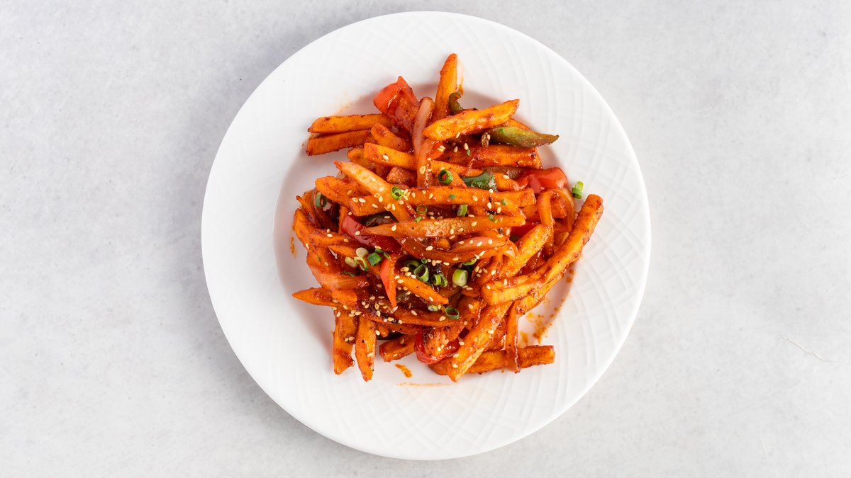 フライドポテトを特製のチリソースで和えた、ピリッと刺激的な辛さが特徴の一品です。おつまみにもおすすめです。/ A dish of french fries tossed in a special chili sauce, characterized by its mild, stimulating spiciness. Recommended as a snack.