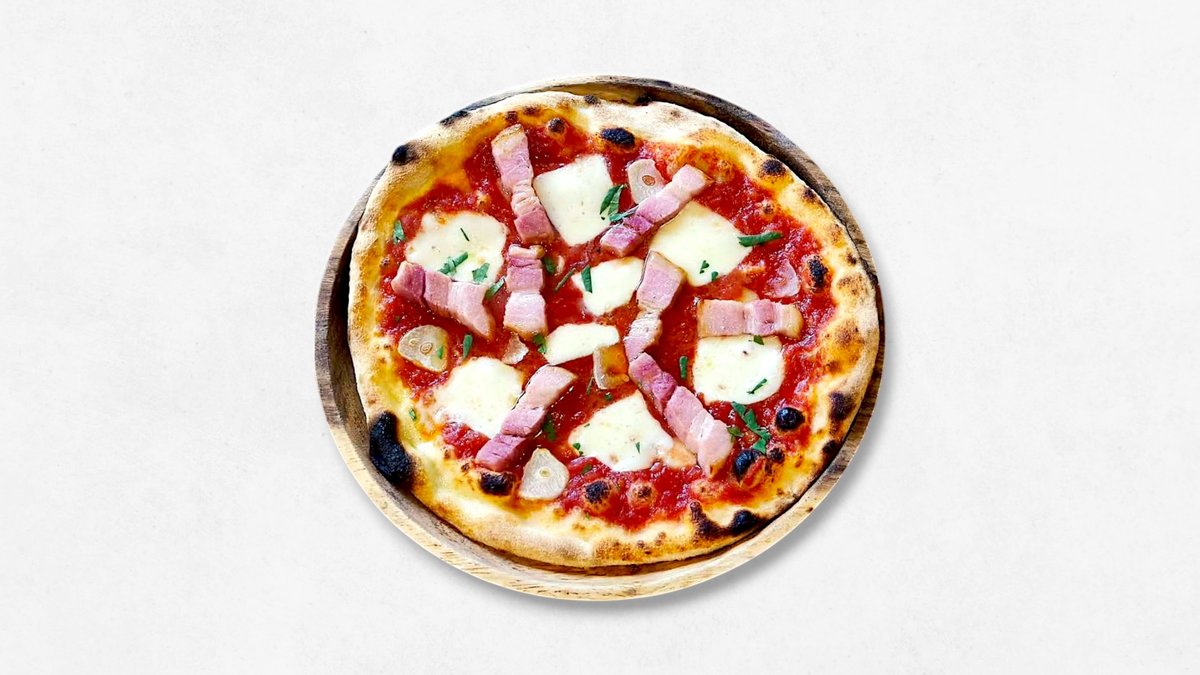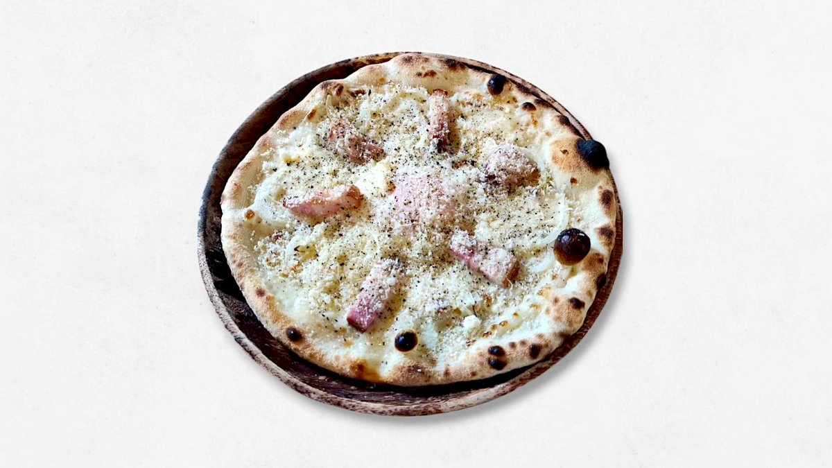 ホワイトソースベースのピザ。ベーコンは「和豚もちぶた」を使用。胡椒がアクセント! (モッツアレラチーズ、玉ねぎ、半熟玉子、ベーコン)