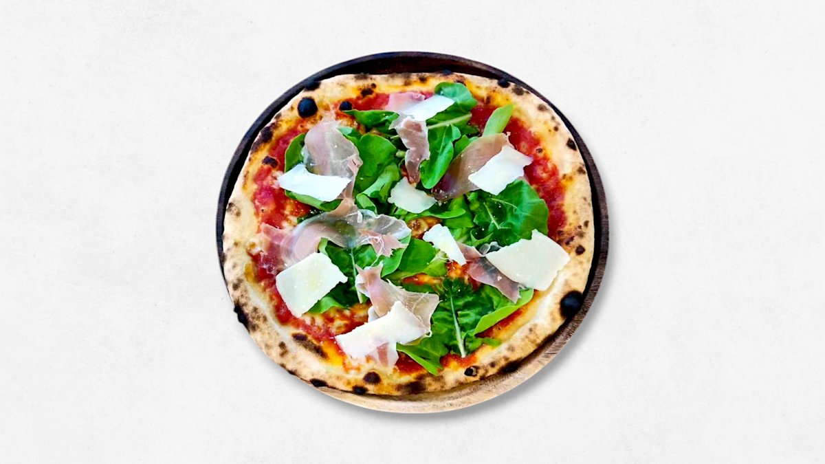 契約農家さんから仕入れている、味のしっかりした無農薬ルッコラを使ったフレッシュなピザ (モッツアレラチーズ、生ハム、ルッコラ、パルジャミーノレッジャーノチーズ)