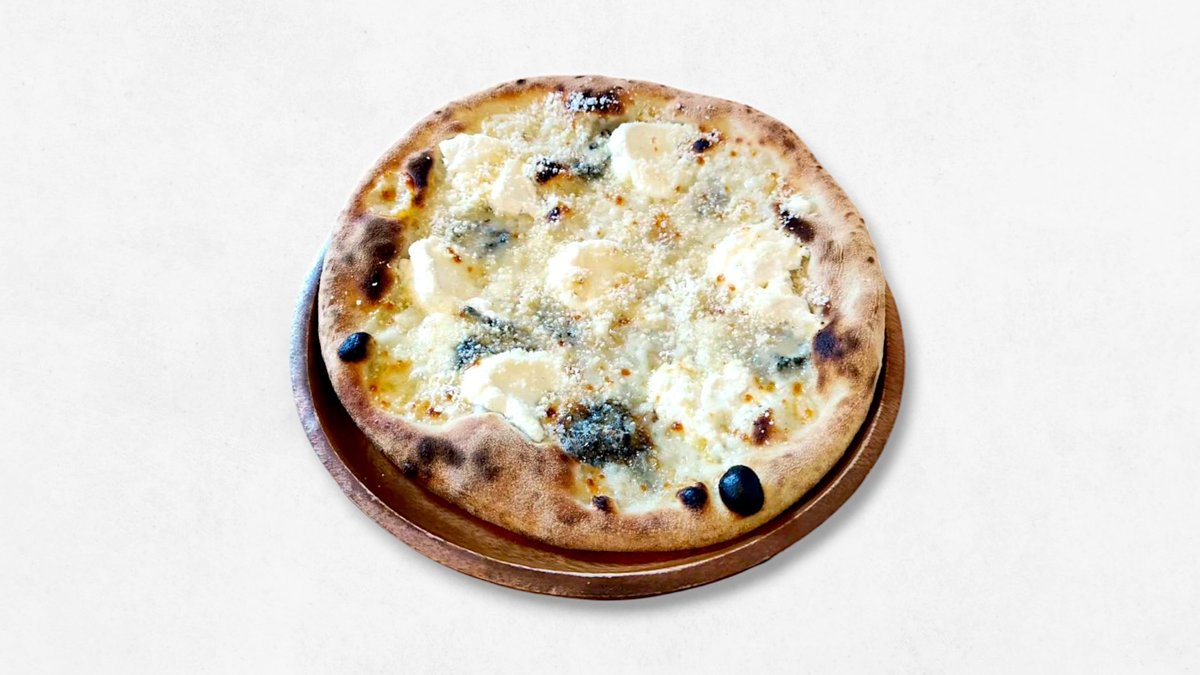 「クワトロ」とはイタリア語で「4」、「フォルマッジ」は「チーズ」の意味。濃厚なピザです (モッツアレラチーズ、リコッタチーズ、ゴルゴンゾーラチーズ、パルジャミーノレッジャーノチーズ)