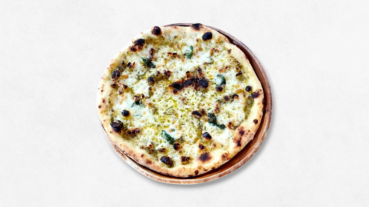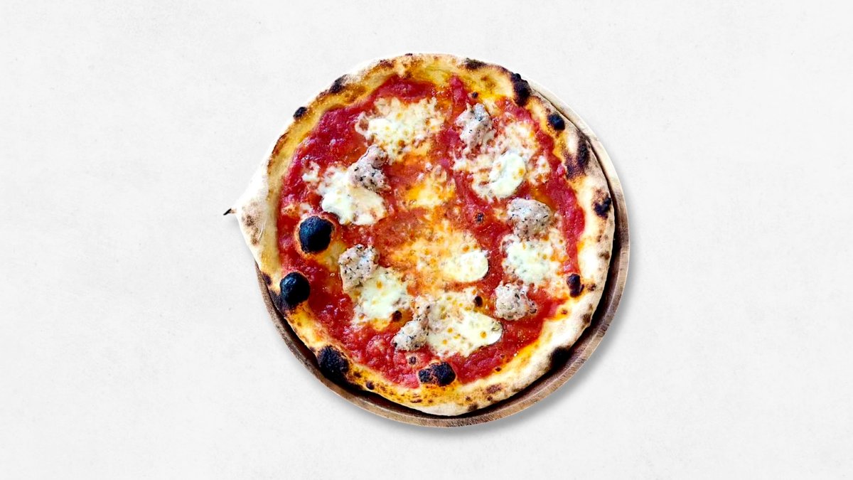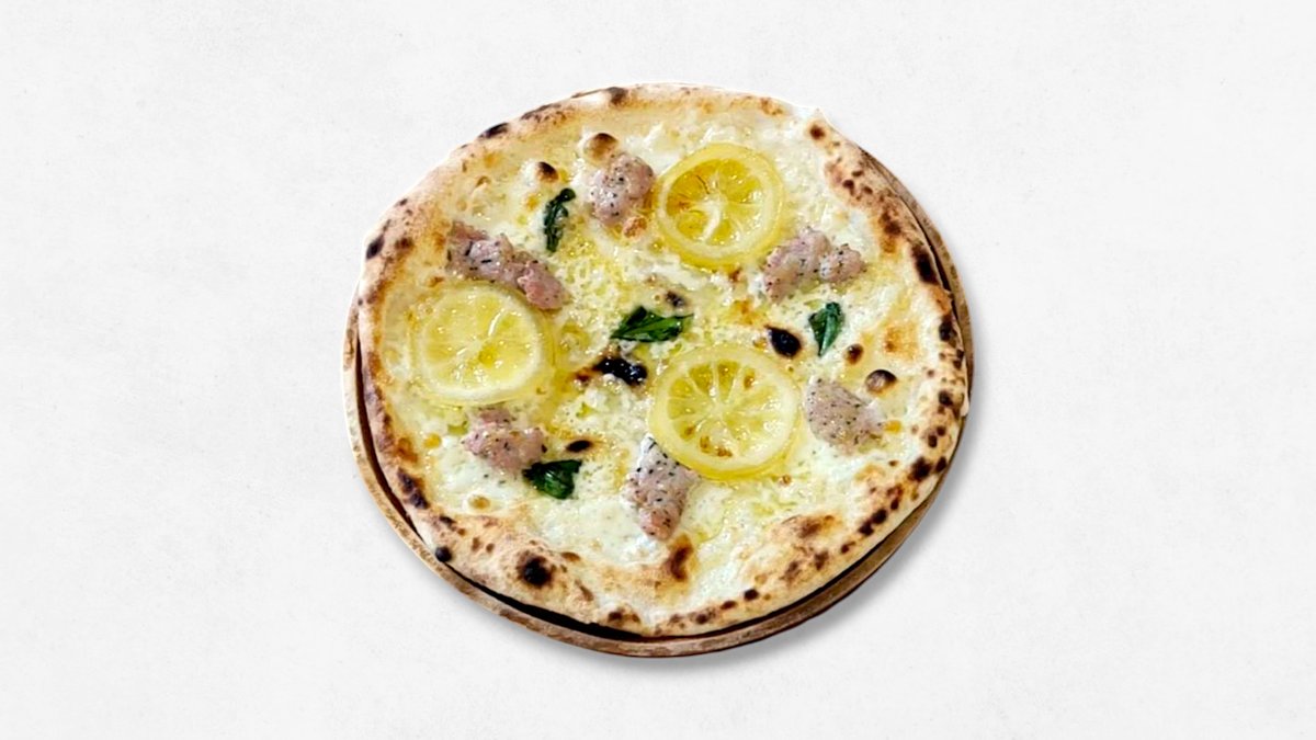 国産生蜂蜜入りシロップ漬けの有機シチリアレモンとサルシッチャのさっぱりピザ。ソースなし (モッツアレラチーズ、シチリアレモン、バジル、サルシッチャ)