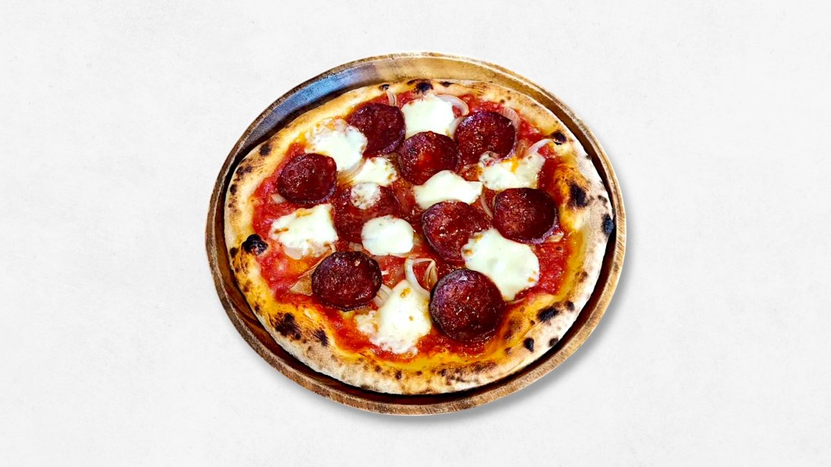 「ティアボラ」とは「悪魔」という意味。辛口サラミがのっているため悪魔の顔になってしまう! (モッツアレラチーズ、玉ねぎ、辛口サラミ)