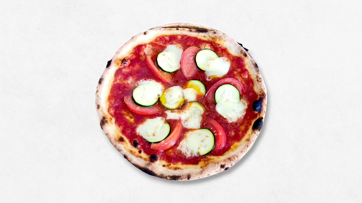 王道のピザをグレードアップ!このピザのモッツアレラチーズは水牛のミルクからできている特別品。 (水牛モッツアレラ、バジル、プチトマト、セミドライトマト)