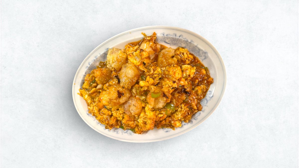 プリプリの海老とふんわり玉子を特製チリソースで仕上げました。ピリ辛が癖になる一品です。ライス付きです。 Plump shrimps and fluffy eggs finished with a special chili sauce. The spicy taste becomes addictive. Comes with rice.
