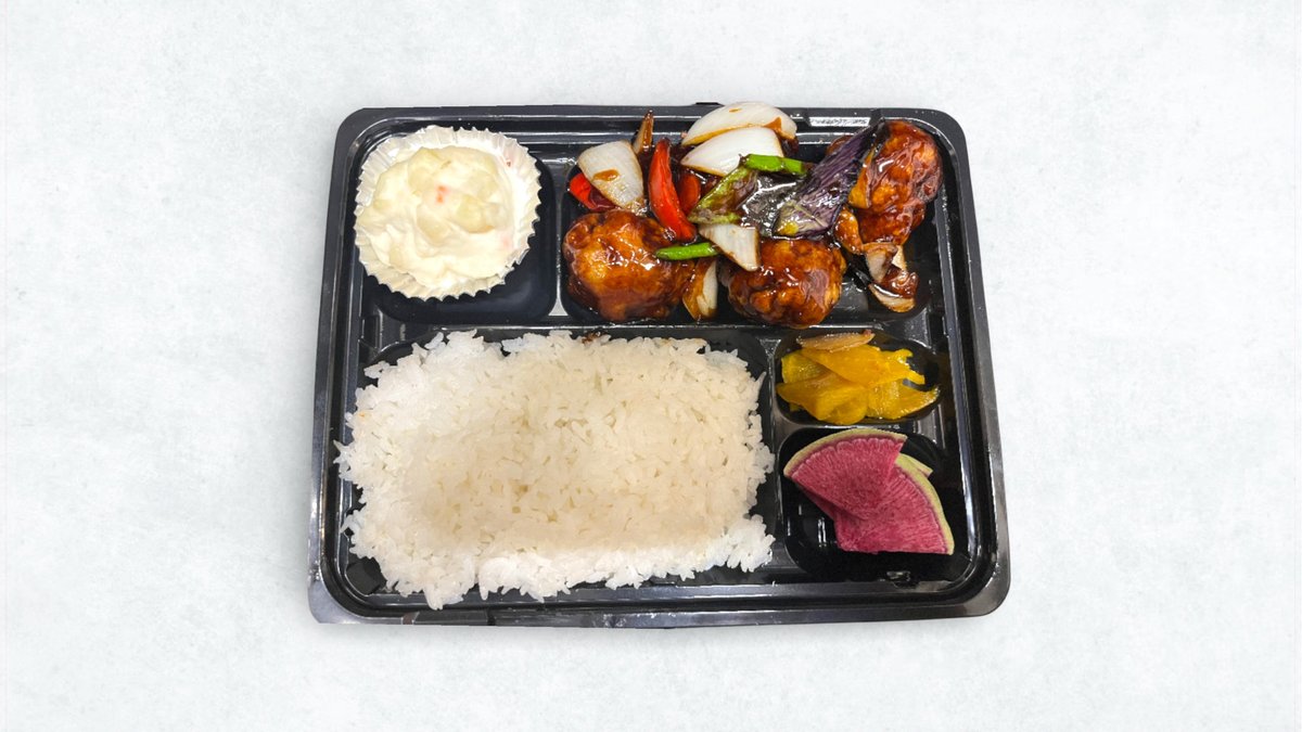 黒酢の芳醇な香りとコクが豚肉の旨味を引き立てる酢豚です。ご飯が進む味わいです。ライス付きです。 Sweet and sour pork with the rich aroma and body of black vinegar brings out the flavor of the pork. It stimulates the appetite. Comes with rice.