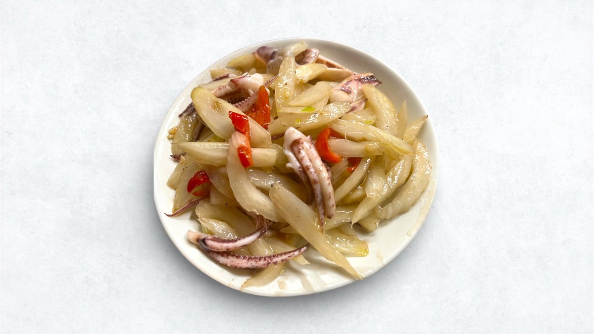 セロリの爽やかな香りがイカのプリプリ感を際立たせる、さっぱりとした塩味の炒め物です。 A refreshing salt-based stir-fry where the aroma of celery complements the tender, springy squid.