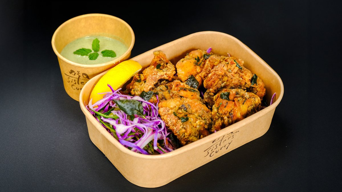 米油で香ばしく揚げたジューシーな南インド風唐揚げ(3個・約110g) 本場南インドのスパイスで漬け込み、グリーンサラダと爽やかなミントソースを添えて。Crispy, juicy South Indian-style chicken (3pcs, approx. 110g), fried in rice oil Marinated with authentic South Indian spices, paired with fresh salad and mint sauce.
