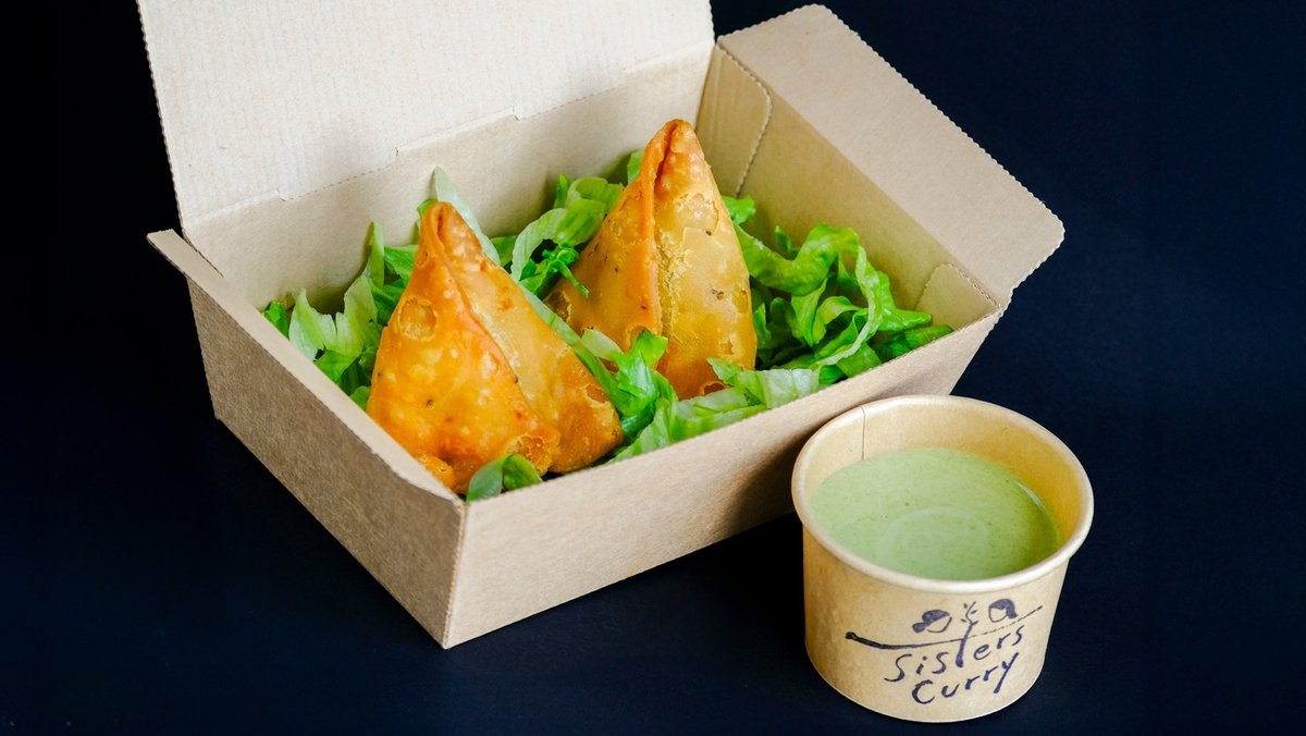 米油で香ばしく揚げたサクサクのサモサ(2個)。 スパイス香るポテトがぎっしり、自家製ミントソースと相性抜群。 Crispy samosas (2pcs) fried in rice oil for a light, golden finish. Stuffed with spiced potatoes and paired with refreshing homemade mint sauce.