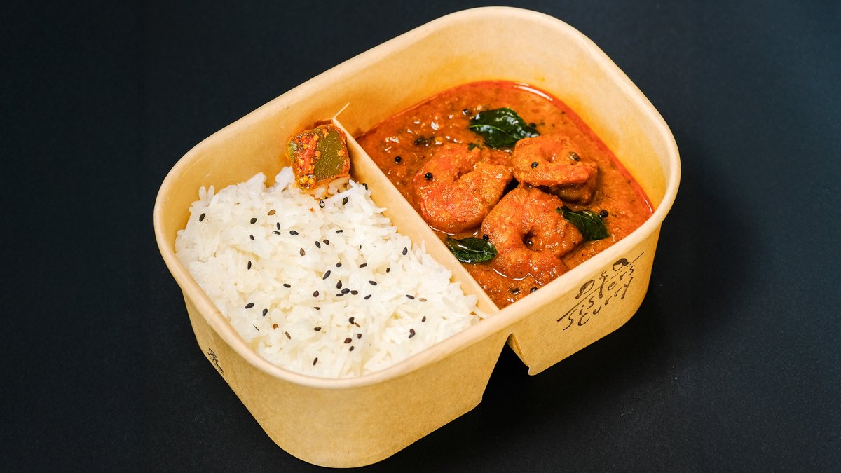 香り豊かな日本米とバスマティ米のブレンドごはんに、カレーリーフとココナッツミルクで仕上げた南インド風エビカレーを添えた一皿。カレーは仕切りで分けているので、お好みでごはんにかけて混ぜながら楽しめます。トマトのアチャール付き。電子レンジ対応・環境にやさしいパッケージでお届けします。 A fragrant blend of Japanese and basmati rice served with a South Indian-style prawn curry enriched with curry leaves and coconut milk. The curry is served on the side with a divider — pour it over the rice and enjoy mixing as you like. Comes with tomato achar. Delivered in microwave-safe, eco-friendly packaging.