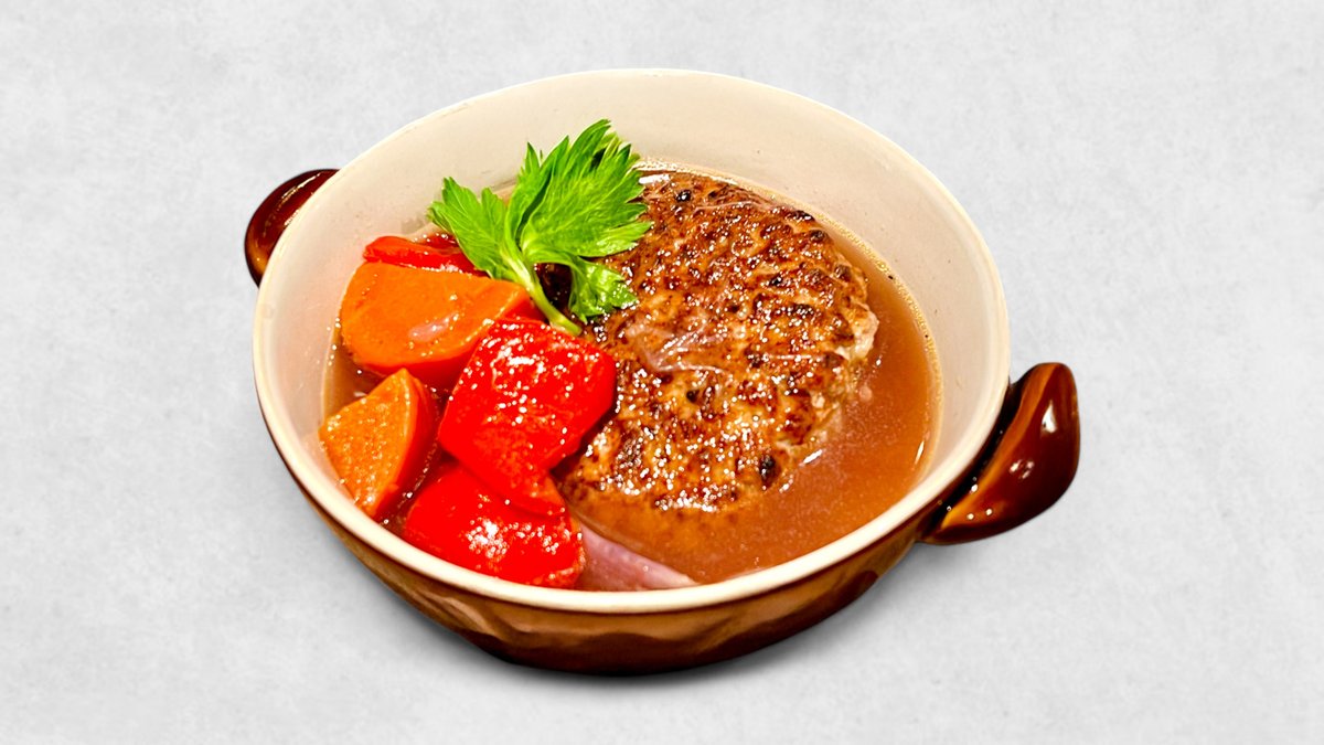 赤パプリカ・アーリーレッド・紫キャベツ・人参など、薬膳で“心と血”を整えるとされる赤野菜をたっぷり使用。 おおぶりなハンバーグを赤ワイン入りボーンブロスでじっくり煮込み、ベジスープとしても楽しめる一杯にしました。 抗酸化力の高い赤の食材が、血液循環と精神安定に働きかけます。 罪悪感ゼロで、夜の整えにぴったりな贅沢スープ。 オプションでご飯とパン、どちらもよく合います。600ml