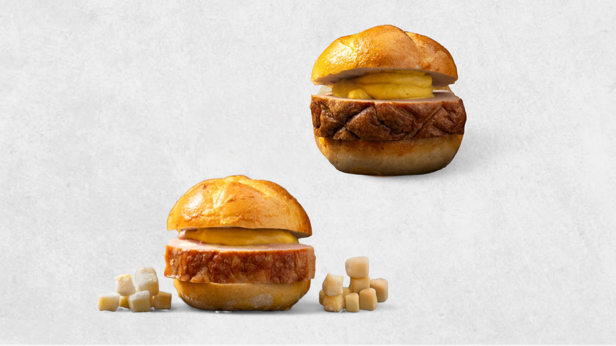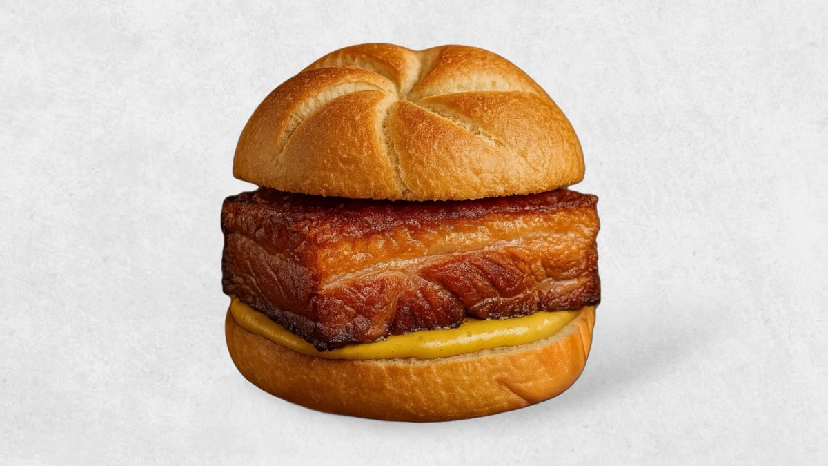 じっくりと焼き上げたジューシーな豚バラ肉を挟んだ、ボリューム満点のドイツ風バーガーです。