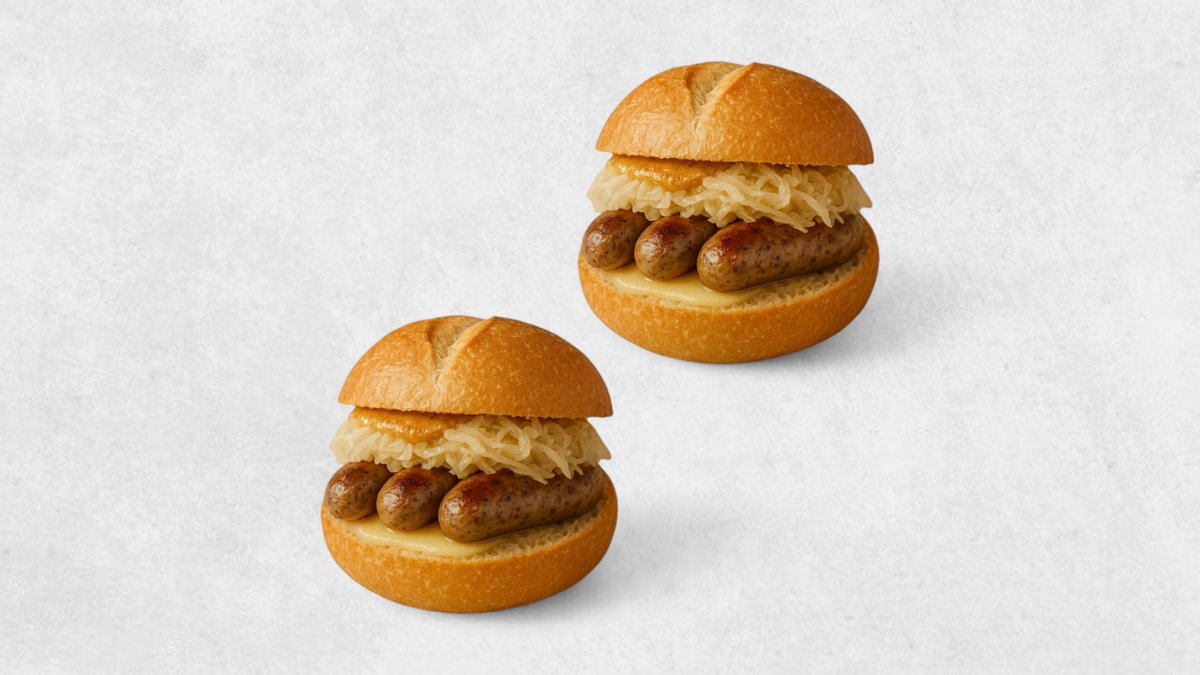 カリッと焼いたニュールンベルガーソーセージ3本に、とろけるチーズ、ザワークラウト、そして甘いマスタードを合わせたドイツ風サンドです。 ボリューム満点で、一度食べたらやみつきになる美味しさです!