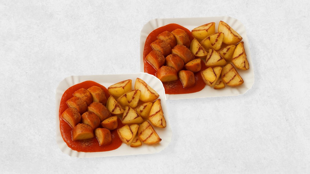 ベルリン名物のカレーソーセージ+ポテトのプレート2個セットです。香ばしくグリルしたソーセージにオーブンポテトをプラス、そして当店特製のカレーソースをトッピングしたドイツ風カレー スパイスの香りが広がりながらも辛すぎずマイルドで、トマトの甘みと酸味がほどよく調和しています ジューシーなソーセージとまろやかなカレーの相性は抜群 一度食べたらやみつきになる味わいです。