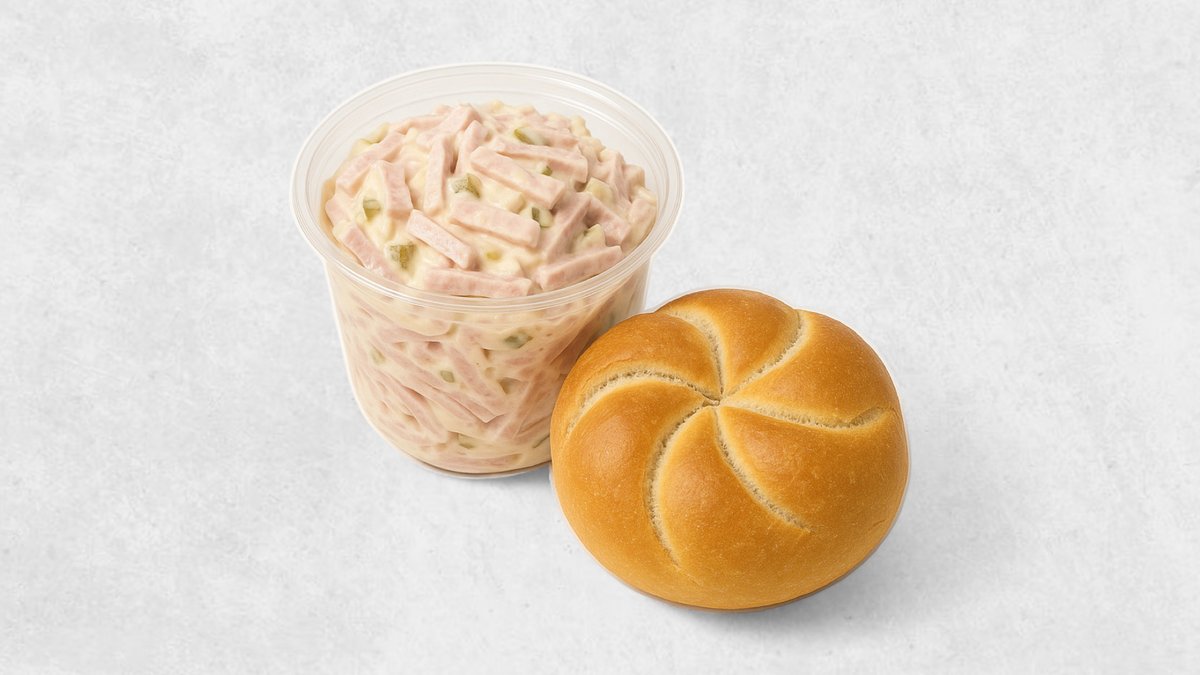 秘密のレシピで作られたドイツ風サラダ「ミートサラダ」+パン1個のセットです。ソーセージとピクルスを細かく刻んだ、クリーミーなサラダをカイザーロールと一緒にお楽しみいただけます。