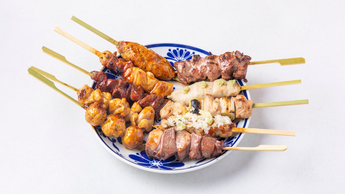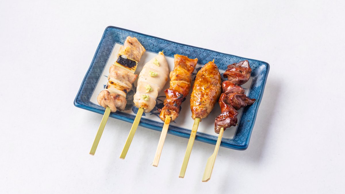 さまざまな部位を味わえる、満足感たっぷりの焼鳥5本セット。
