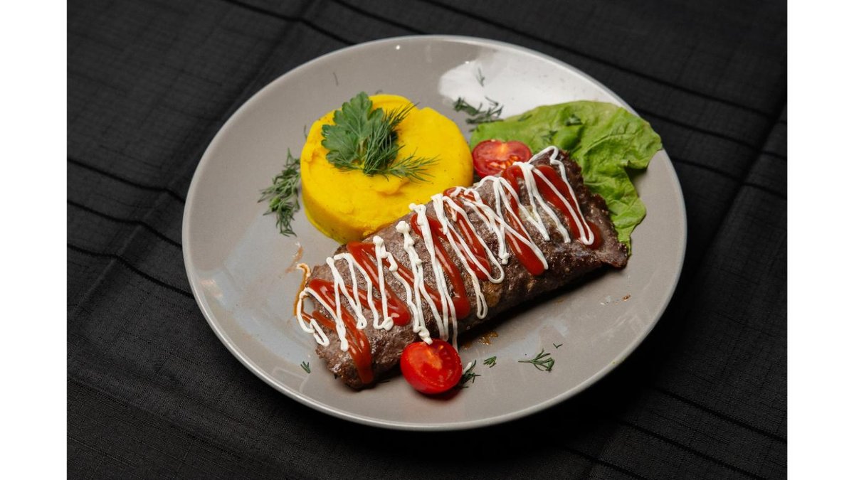(сиыр еті, тұздалған қияр, шампиньон саңырау құлақтары, пияз, картоп пюресі, салат жапырақтары, п/п Вегетта, тұз/мясо говяжий, огурцы маринованные, грибы шампиньоны, лук репчатый, картофельное пюре, лист салата, п/п Вегетта, соль.)