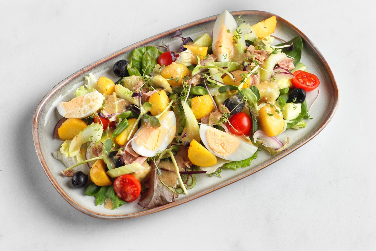 Полезный и необычный салат из отварной свеклы, сочной груши, творожным сыром с кисло-сладкой оливковой заправкой.