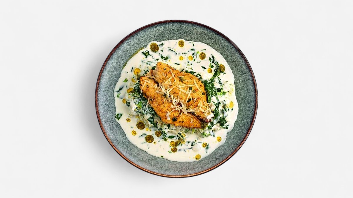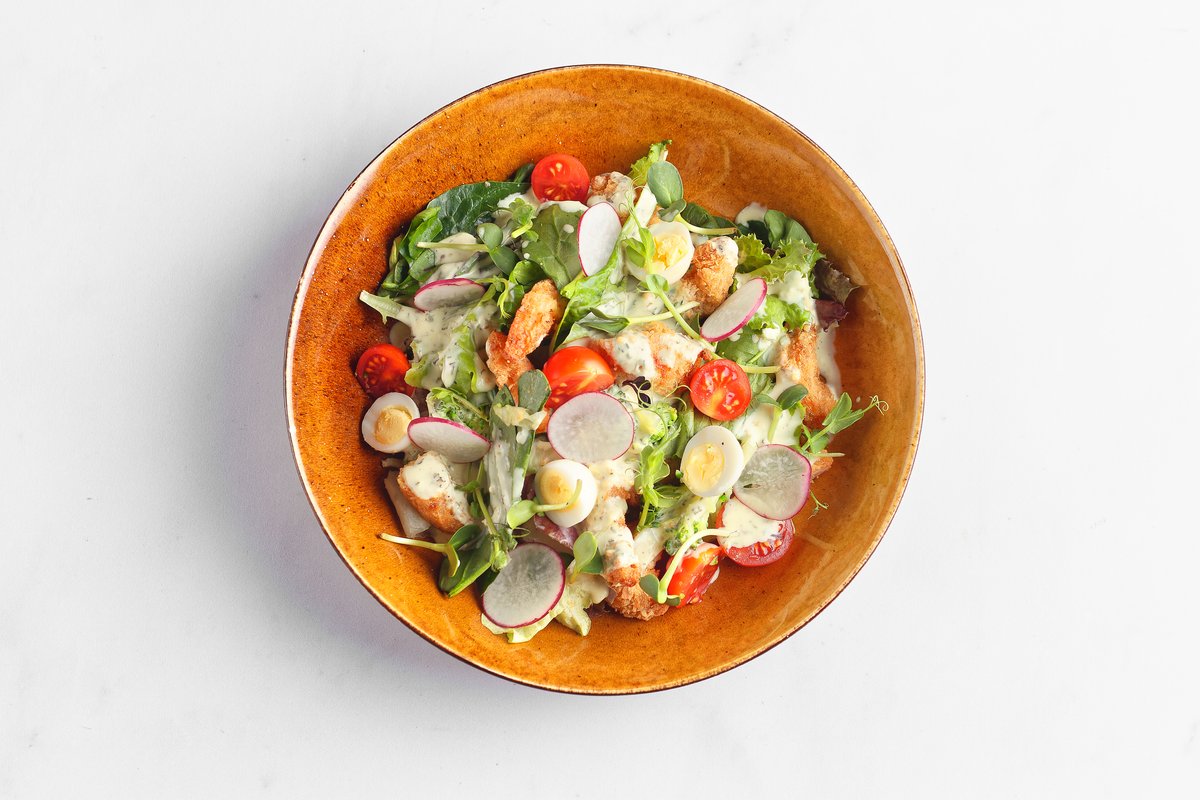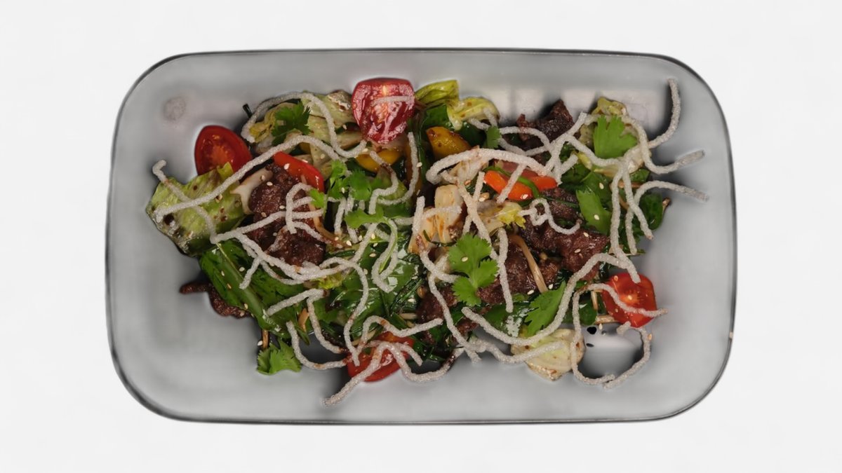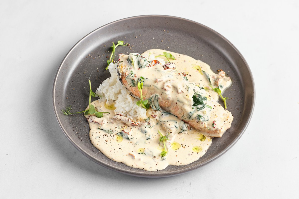 Курица в соусе терияки, кусочки манго, шпинат, огурцы, брокколи