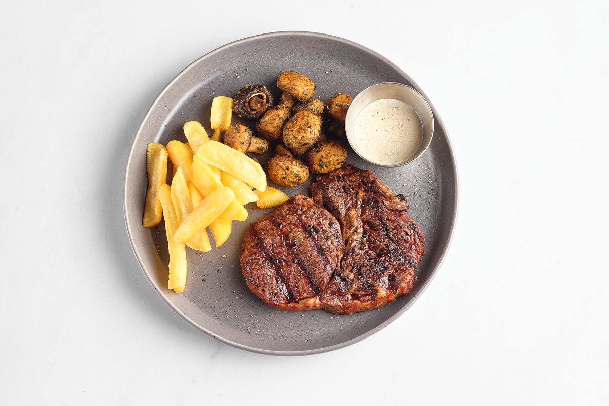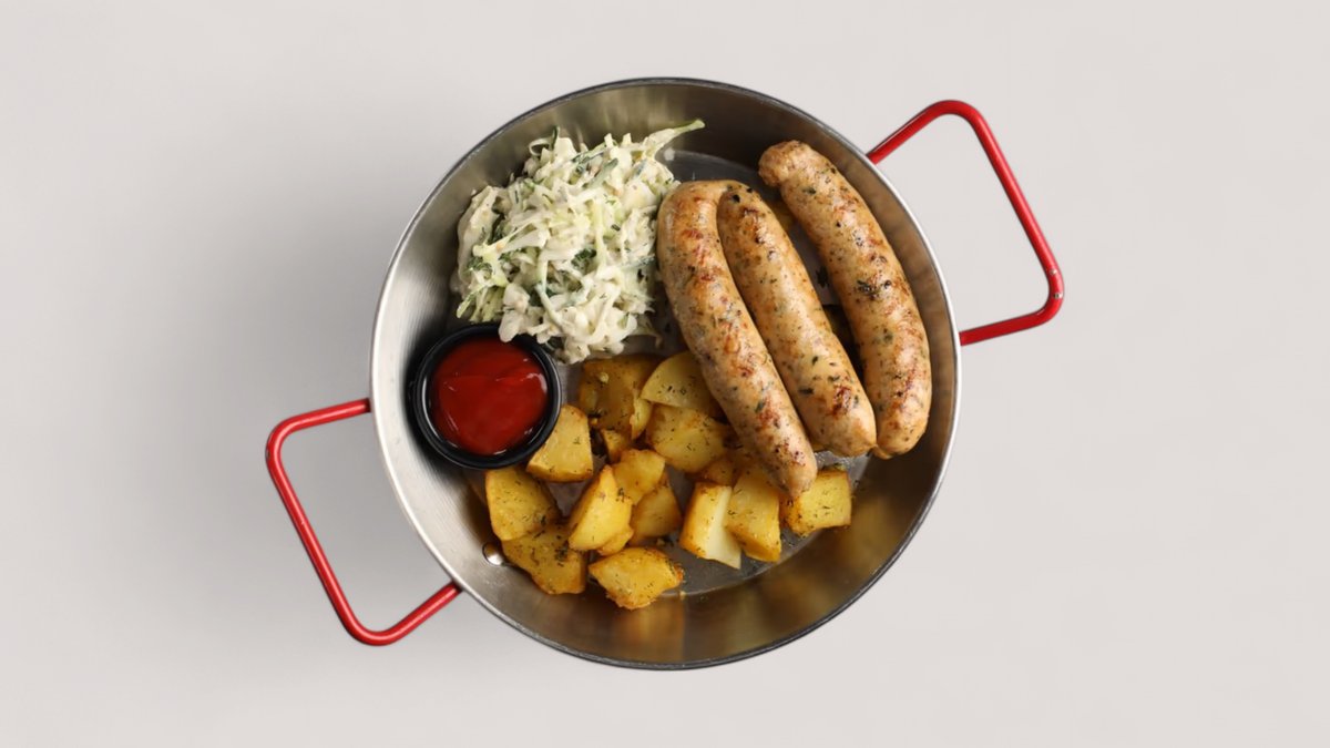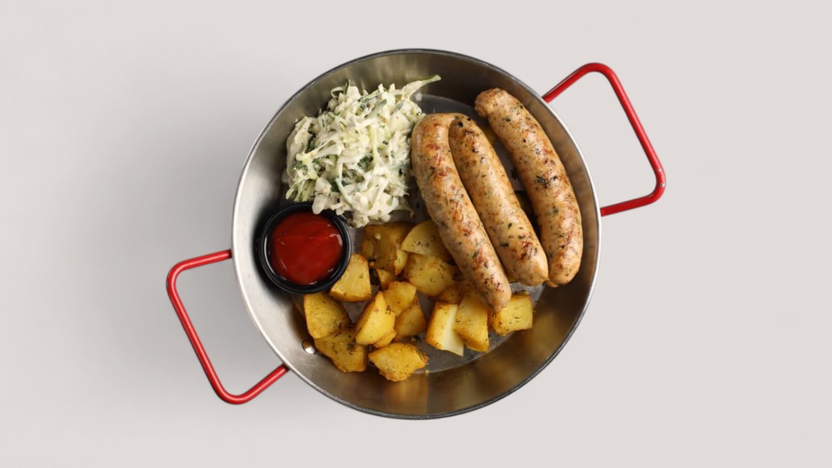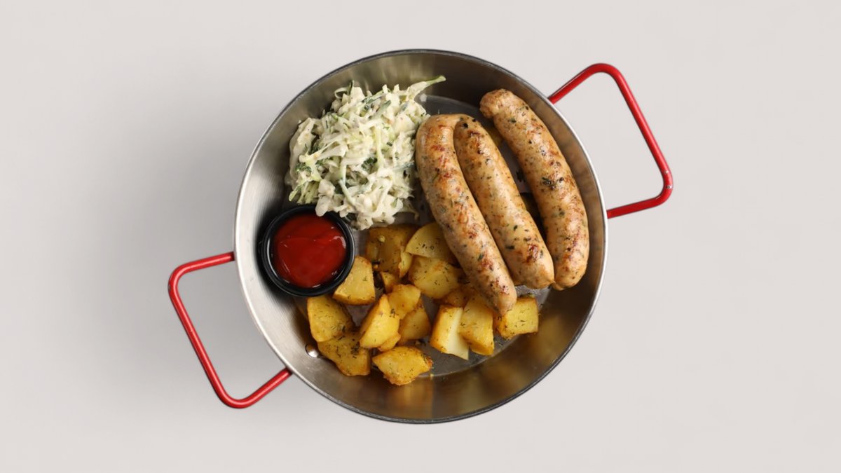 Колбаски из говядины, восточные, конины и курицы с обжаренным картофелем и соленьями + кетчуп и горчица