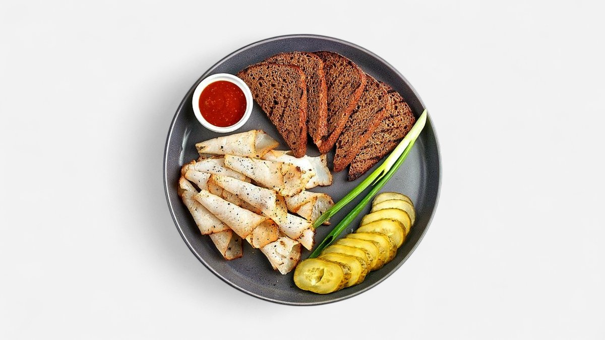 Ломтики малосольного копченого курдюка с аджикой и кусочками ржаного хлеба