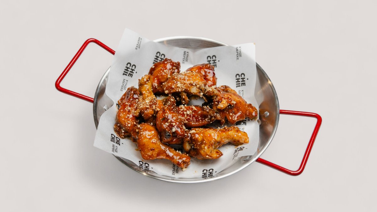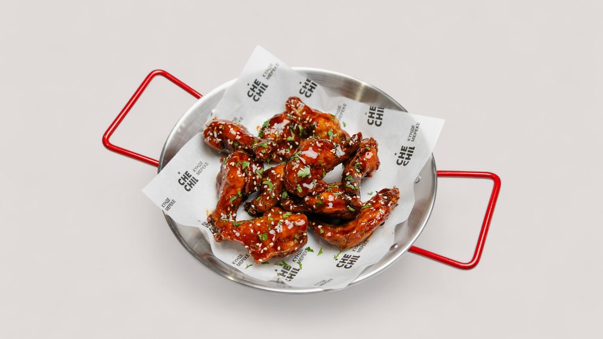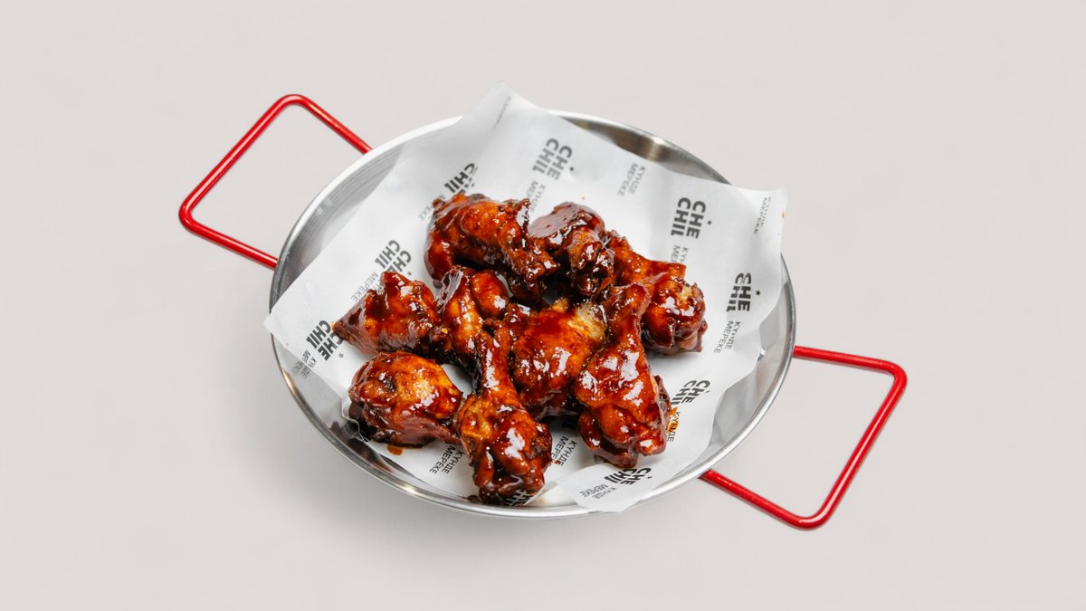 Четыре вида жареных куриных крыльев: Луизиана, Барбекю, Свит чили, Терияки. Подаем с пряным соусом, морковью и сельдереем