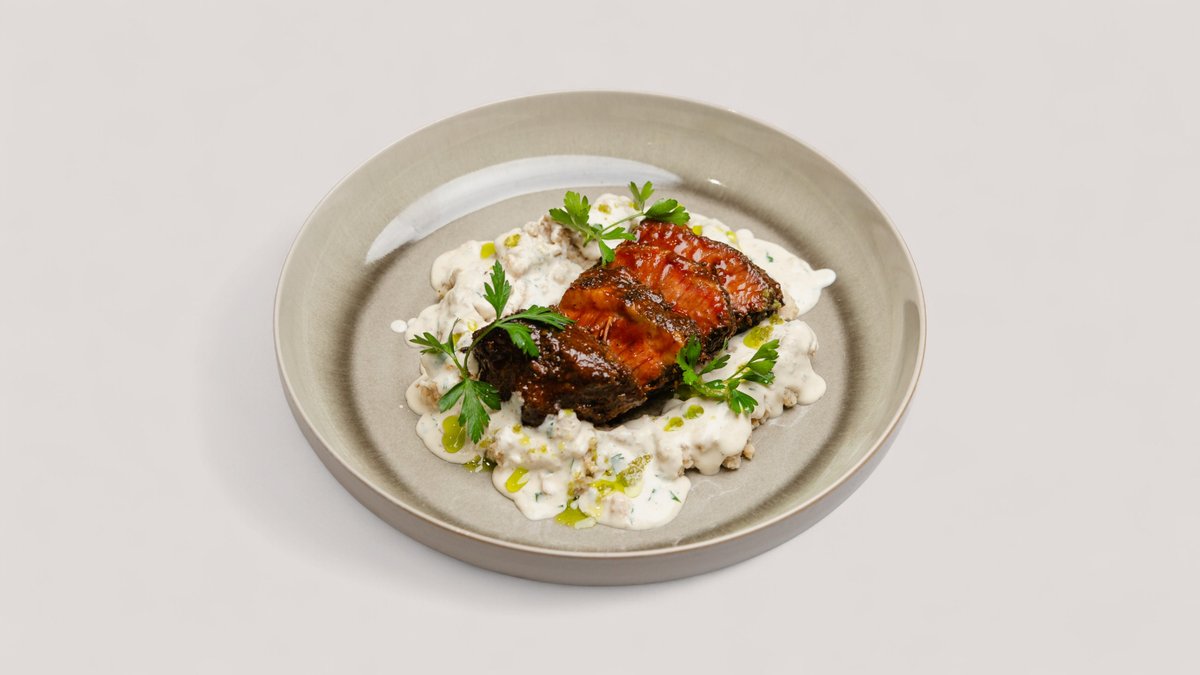 Кусочки говядины с картофелем и грибами, запеченные в сливочном соусе и сыром
