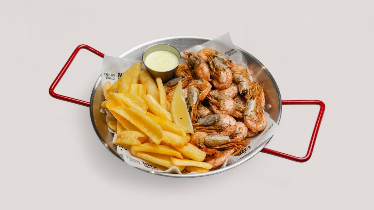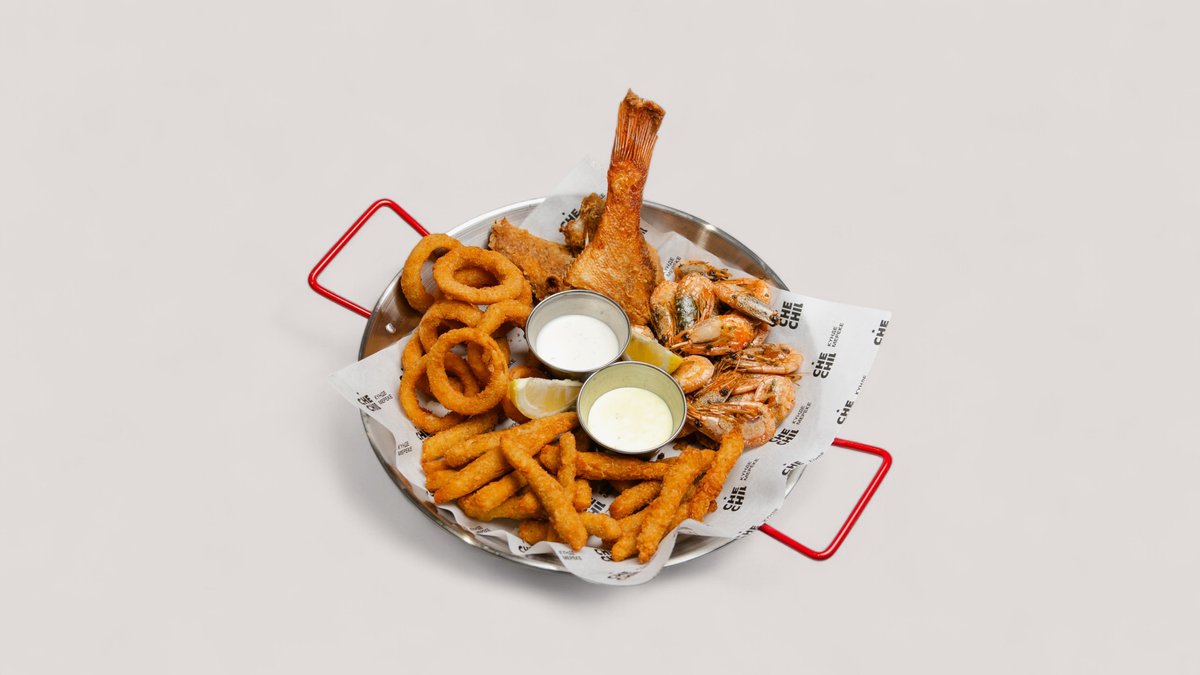 Рыбка жареная, кольца кальмара, креветки, рыбные пальчики, гарлики, соуса тартар и айоли