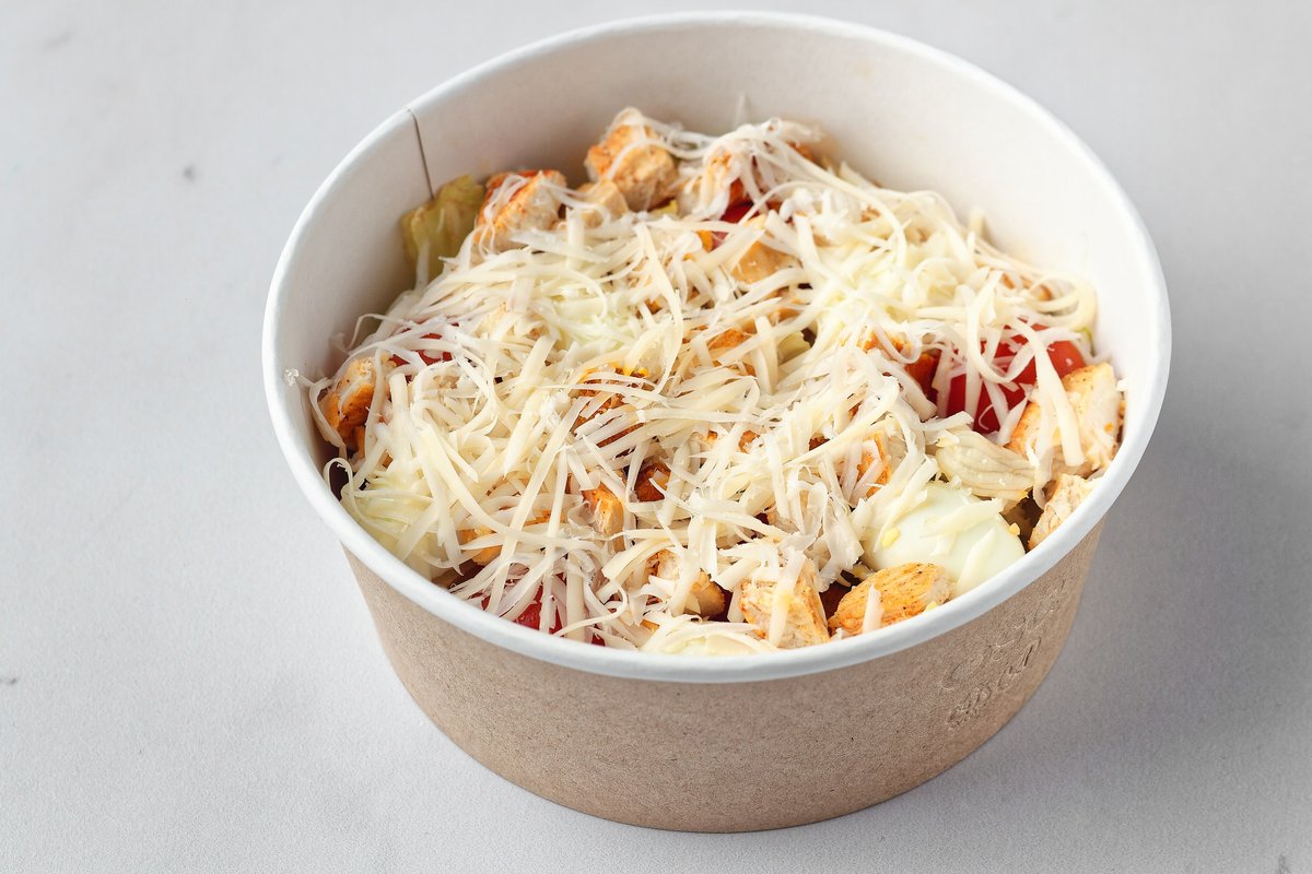 Состав: ржаные сухари, айсберг, перепелиное яйцо, черри, куриная грудка, пармезан. КБЖУ на порцию: 212,4/26,1/11/2