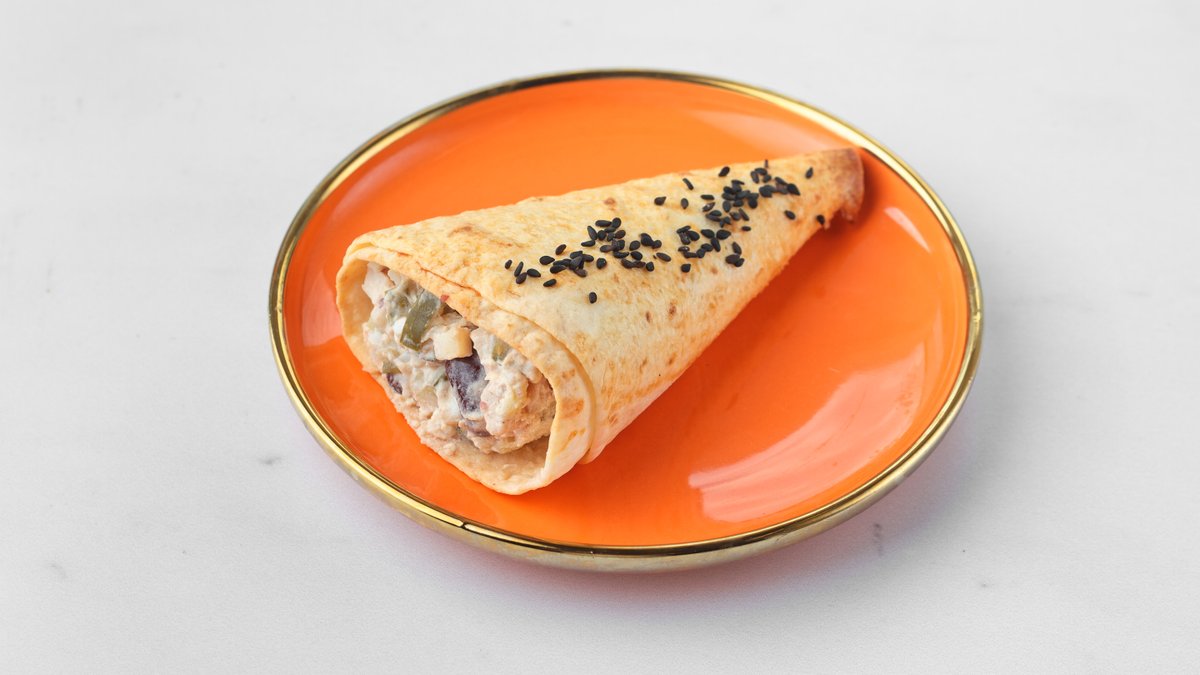 Состав: мексиканская лепешка, куриный рулет, красная фасоль, яйцо вареное, соленые огурцы, творожный сыр. КБЖУ на порцию: 362/13,4/23,2/26