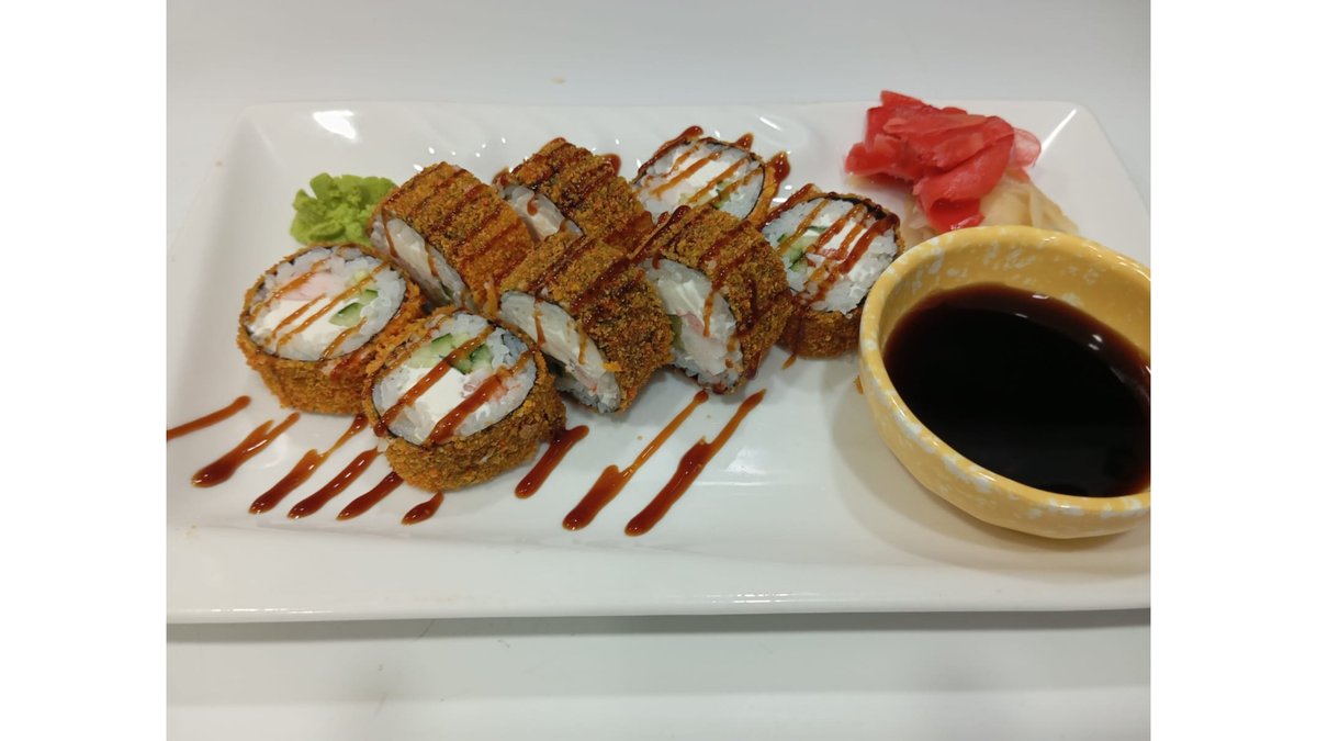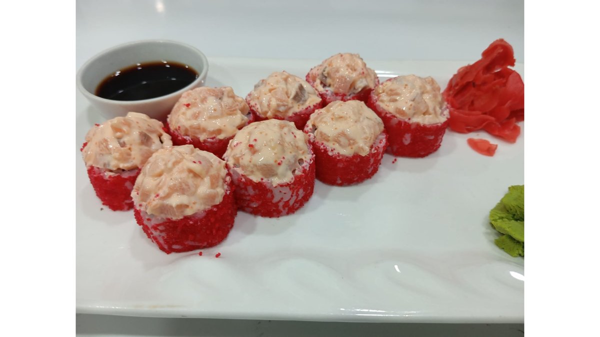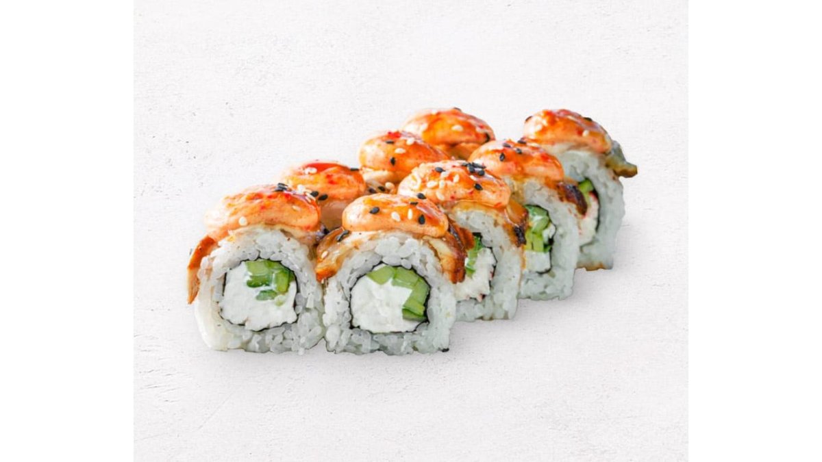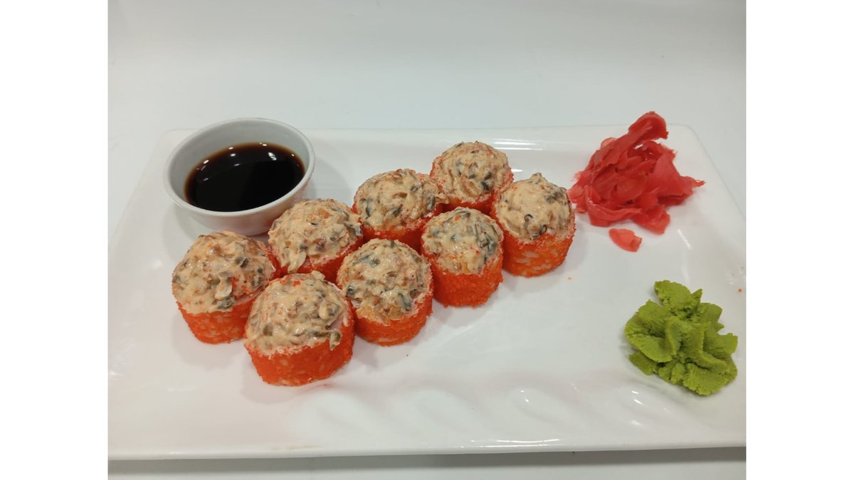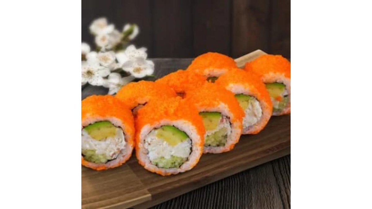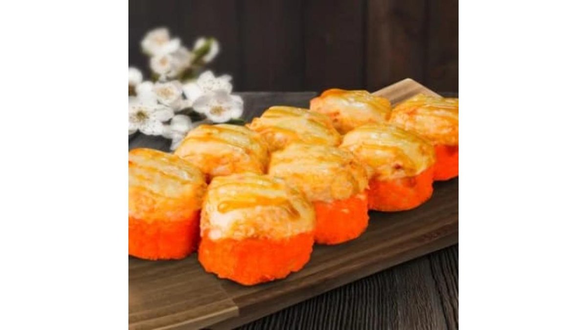 Rice, cream cheese, cucumber, fried salmon, masago caviar, baking sauce