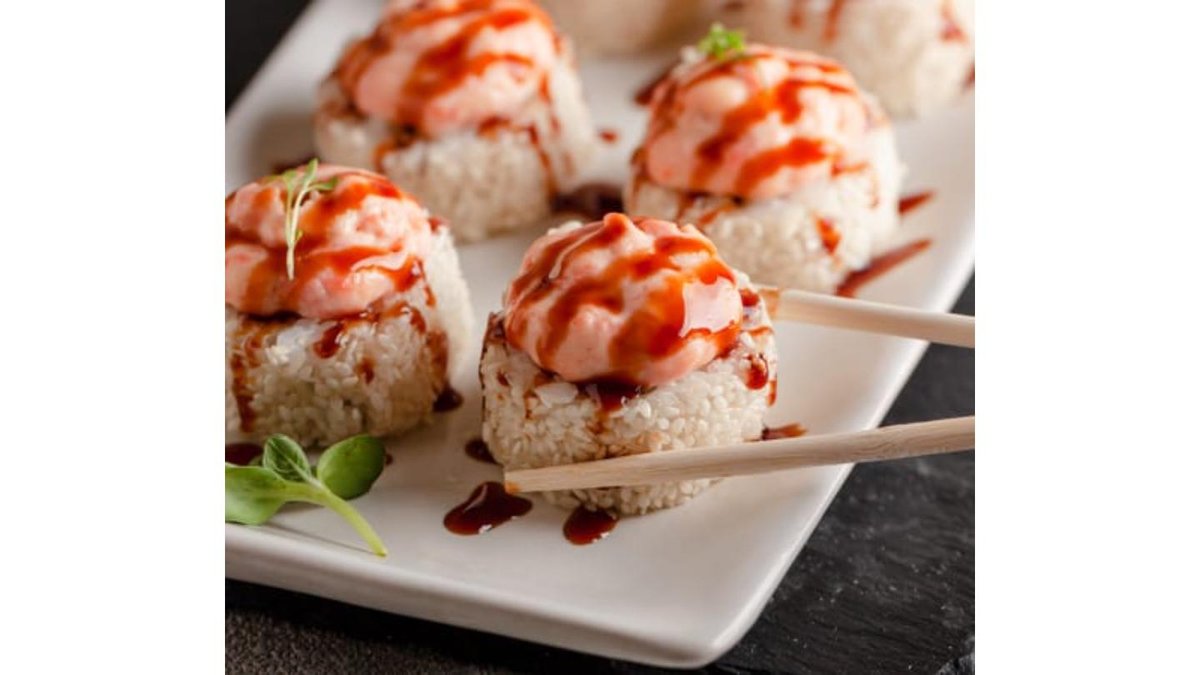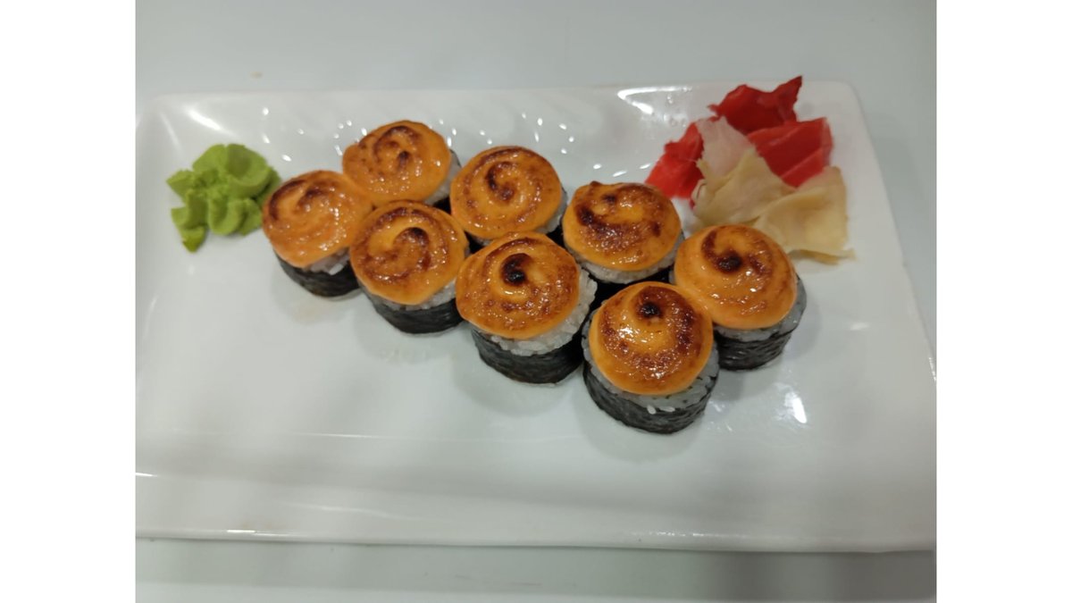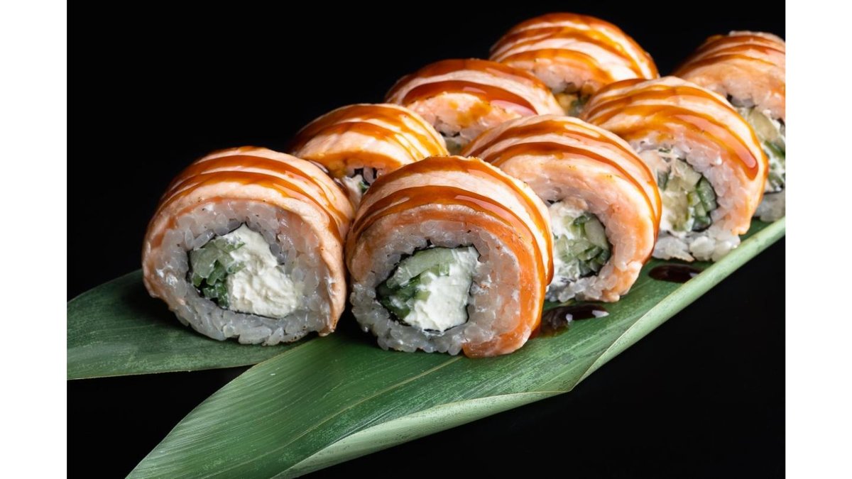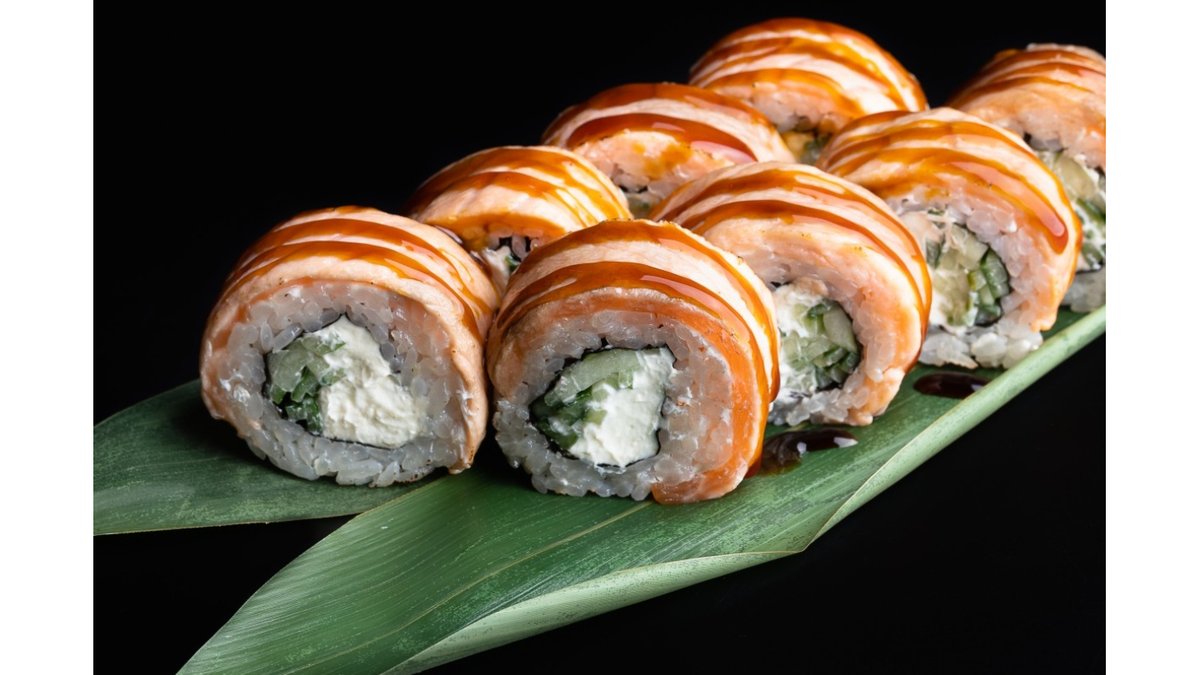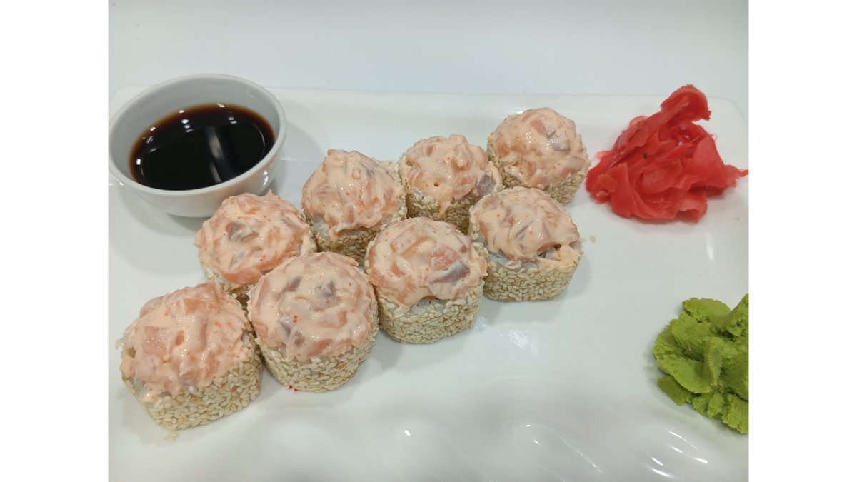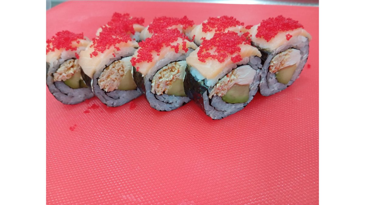 Rice, cream cheese, cucumber, fried salmon, masago caviar, baking sauce