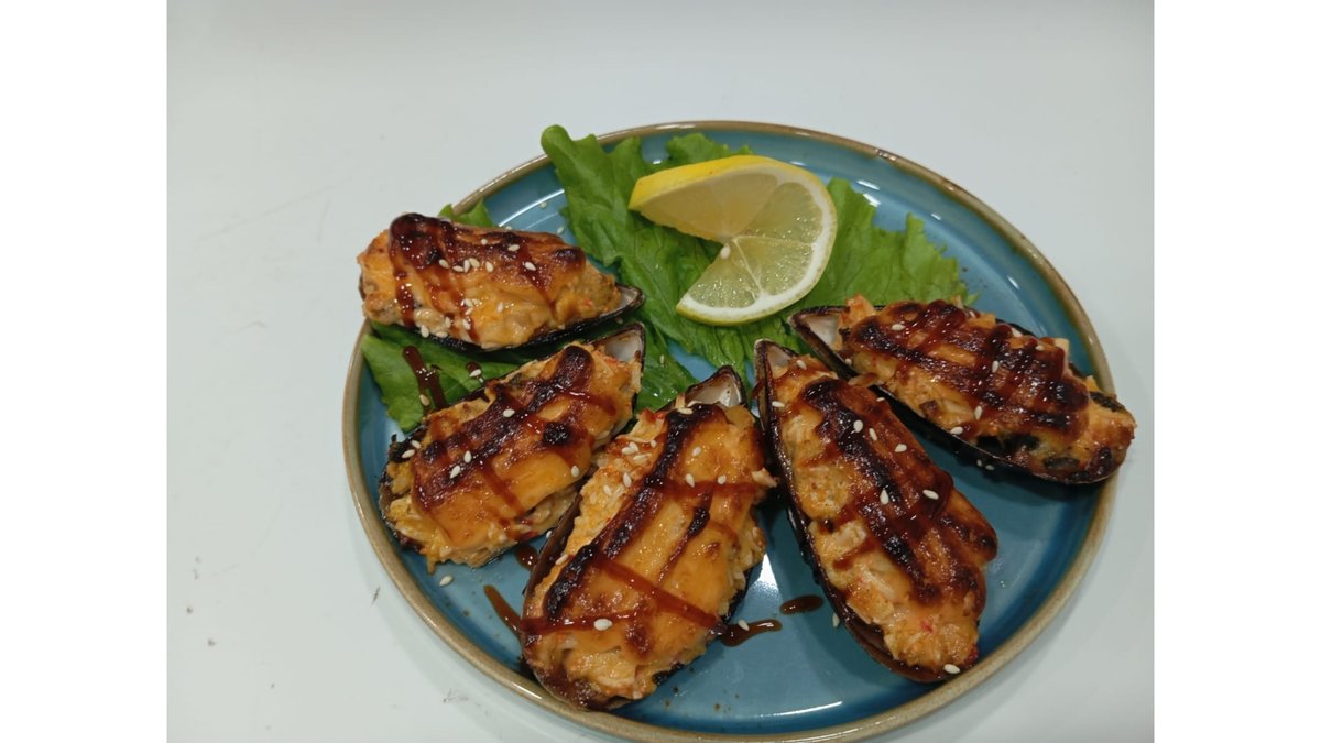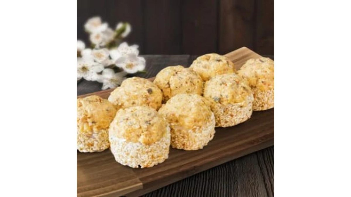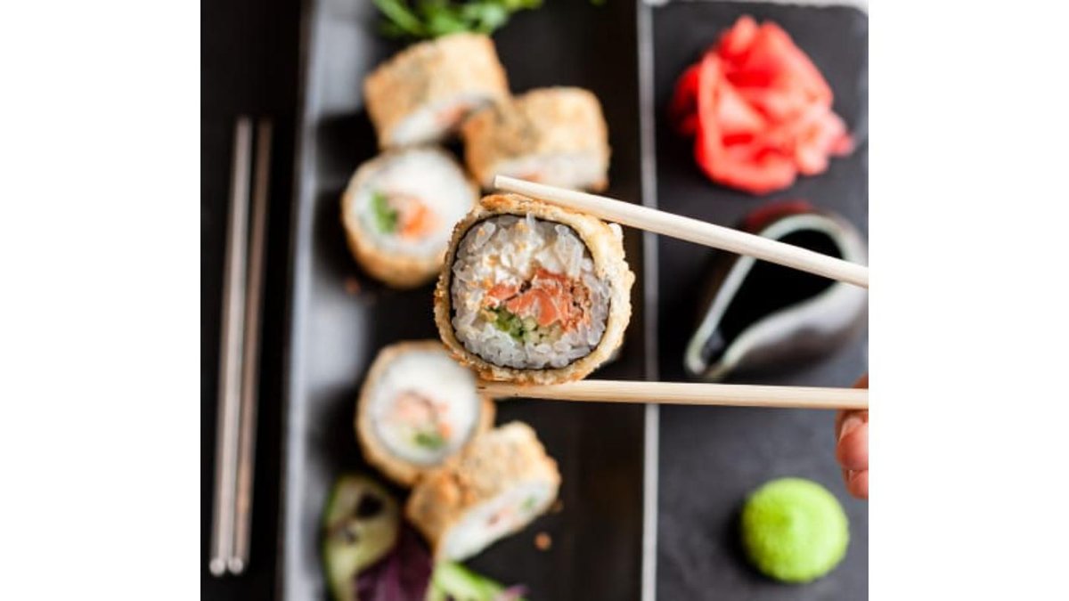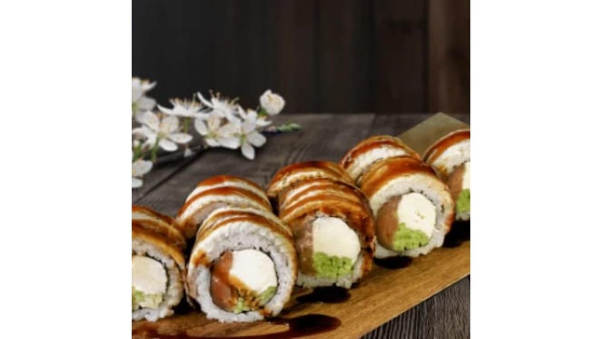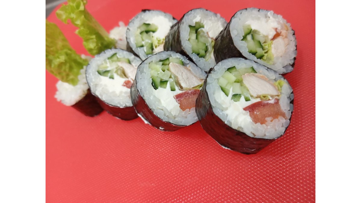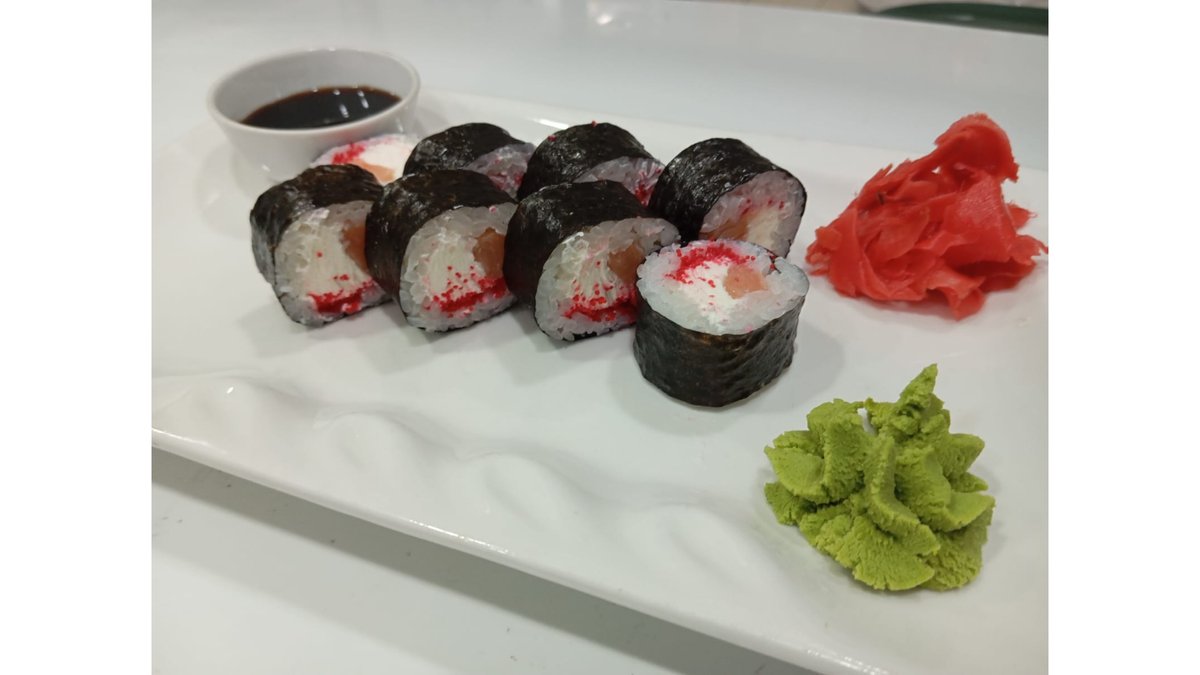 Rice, cream cheese, cucumber, fried salmon, masago caviar, baking sauce