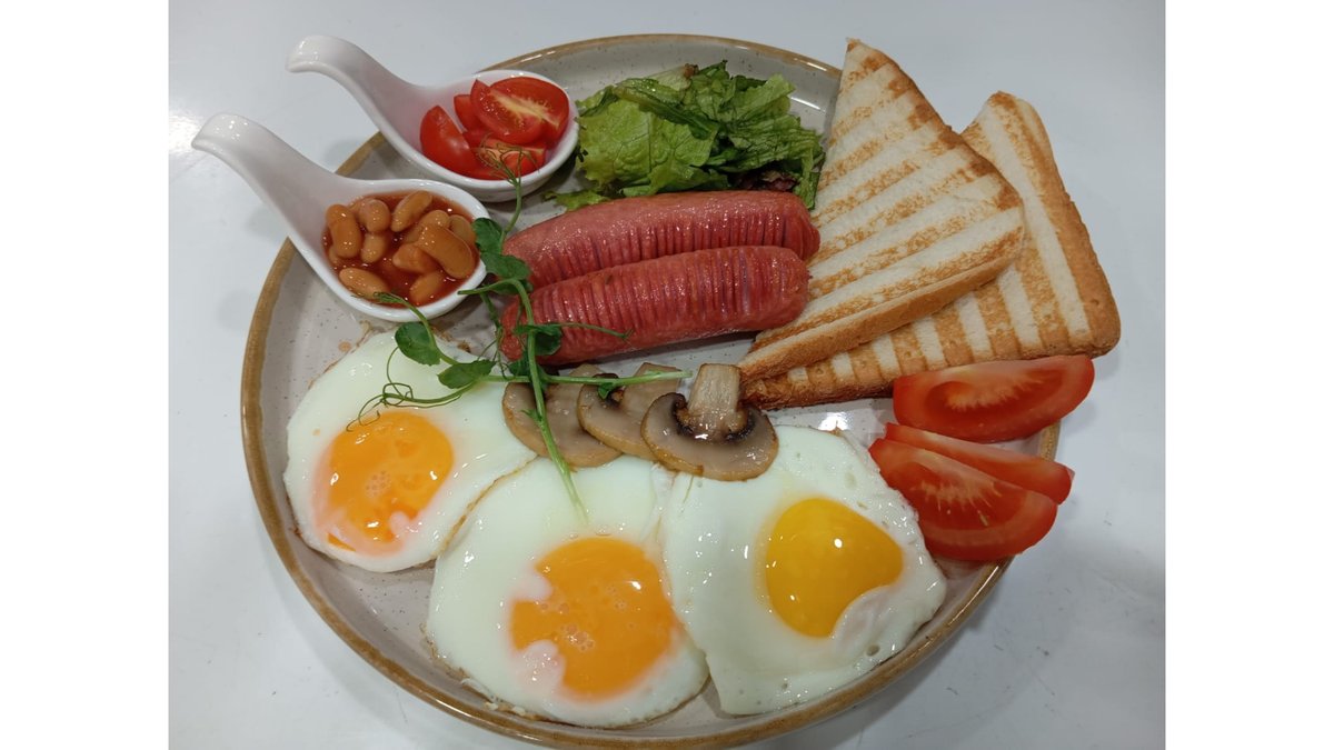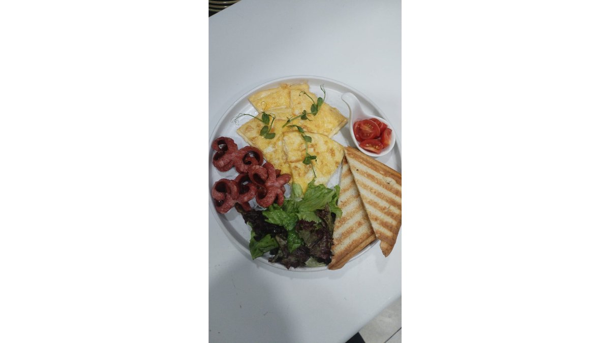 3-egg omelet, hunting sausages, cherry tomatoes, mixed salad, toast