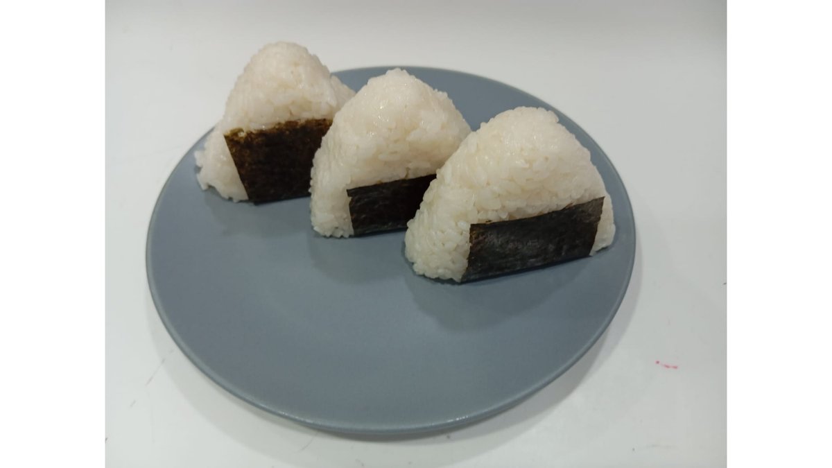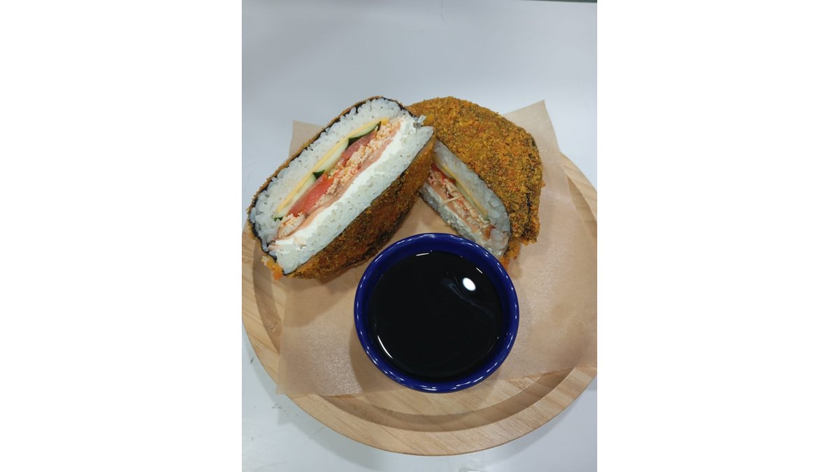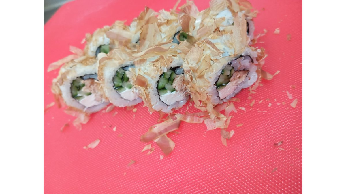 Rice, cream cheese, cucumber, fried salmon, bonito flakes