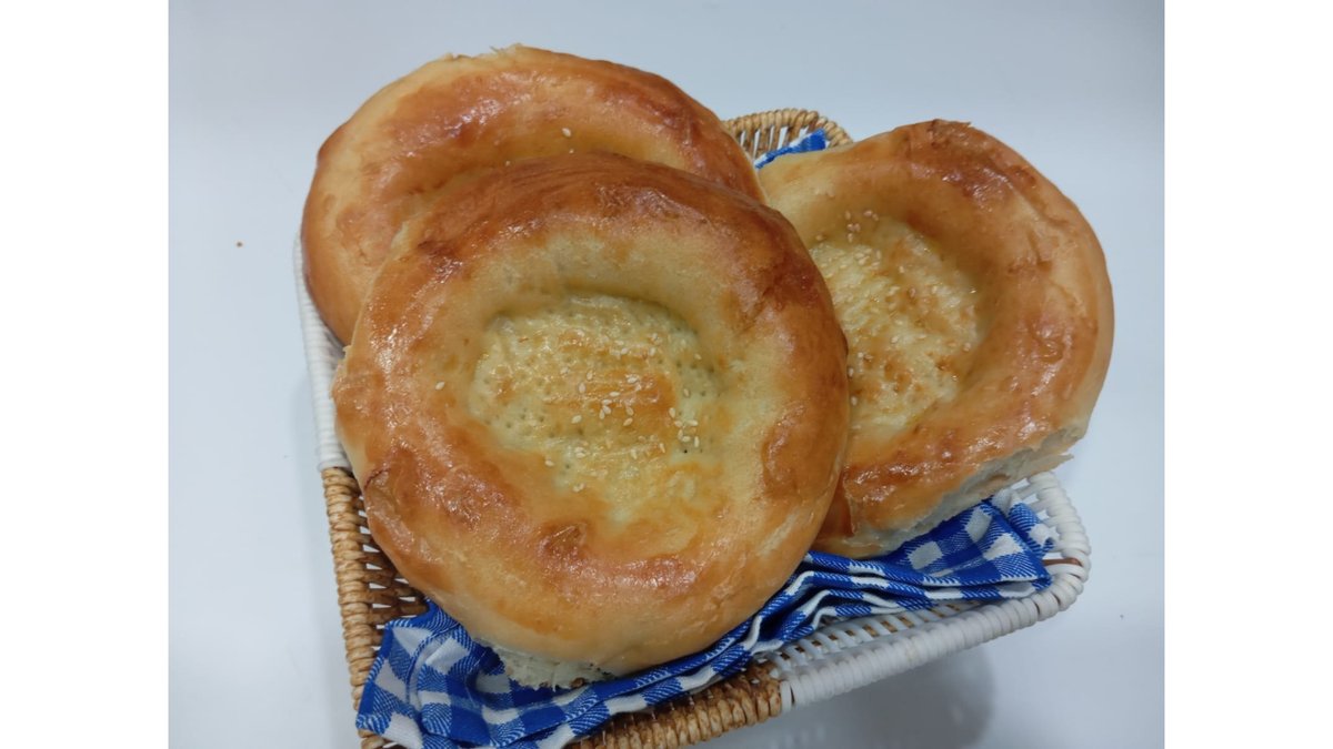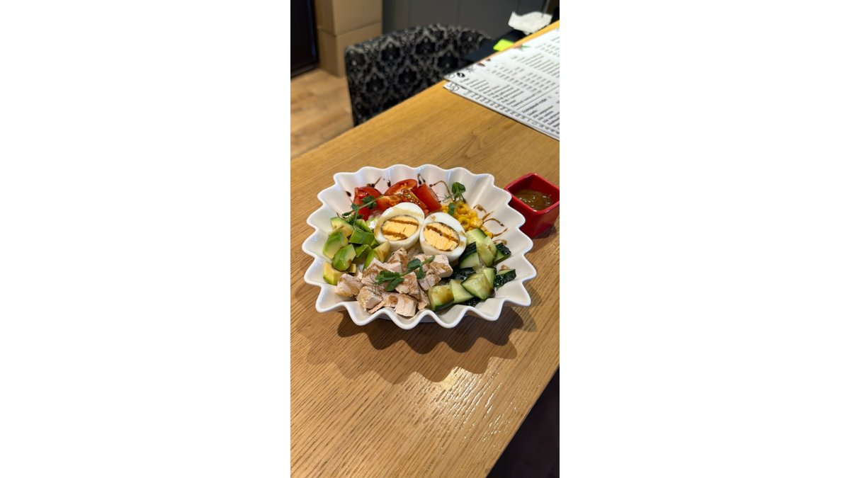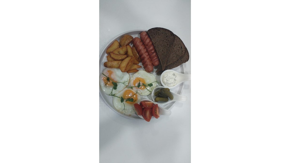 Fried eggs, black bread, cherry tomatoes, chicken sausages, cucumbers, gherkins, wedges, sour cream & garlic sauce