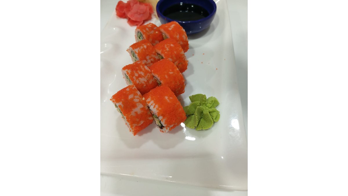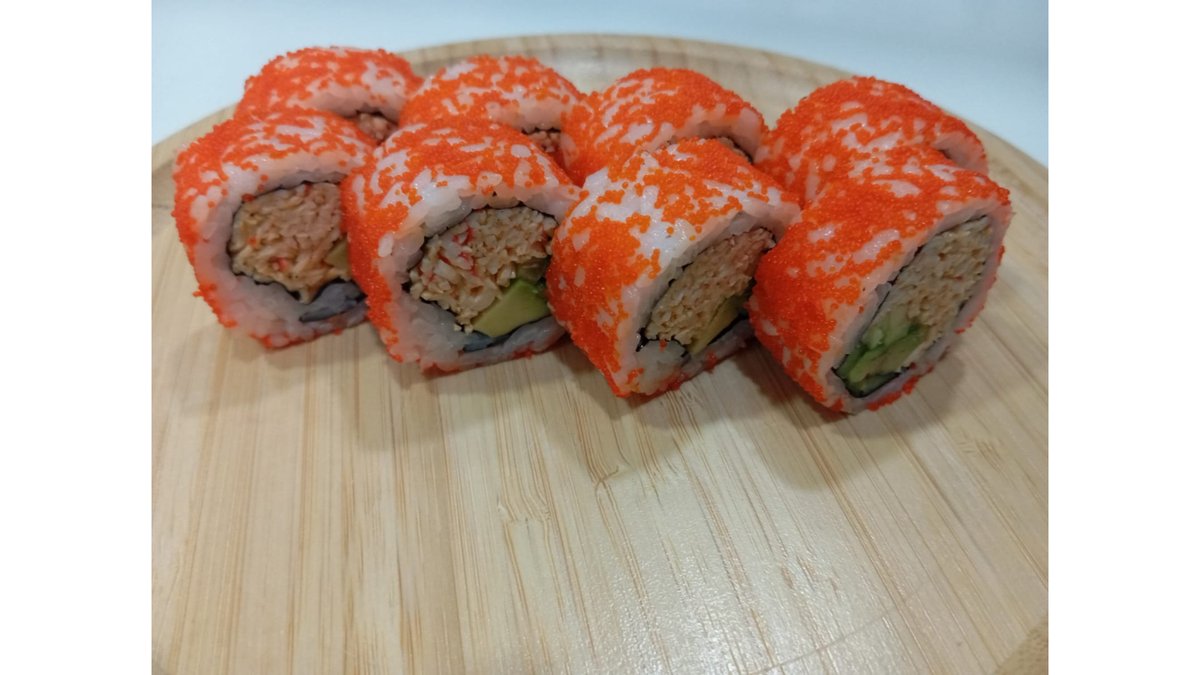 Rice, cream cheese, crab mix, avocado, cucumbers, masago caviar