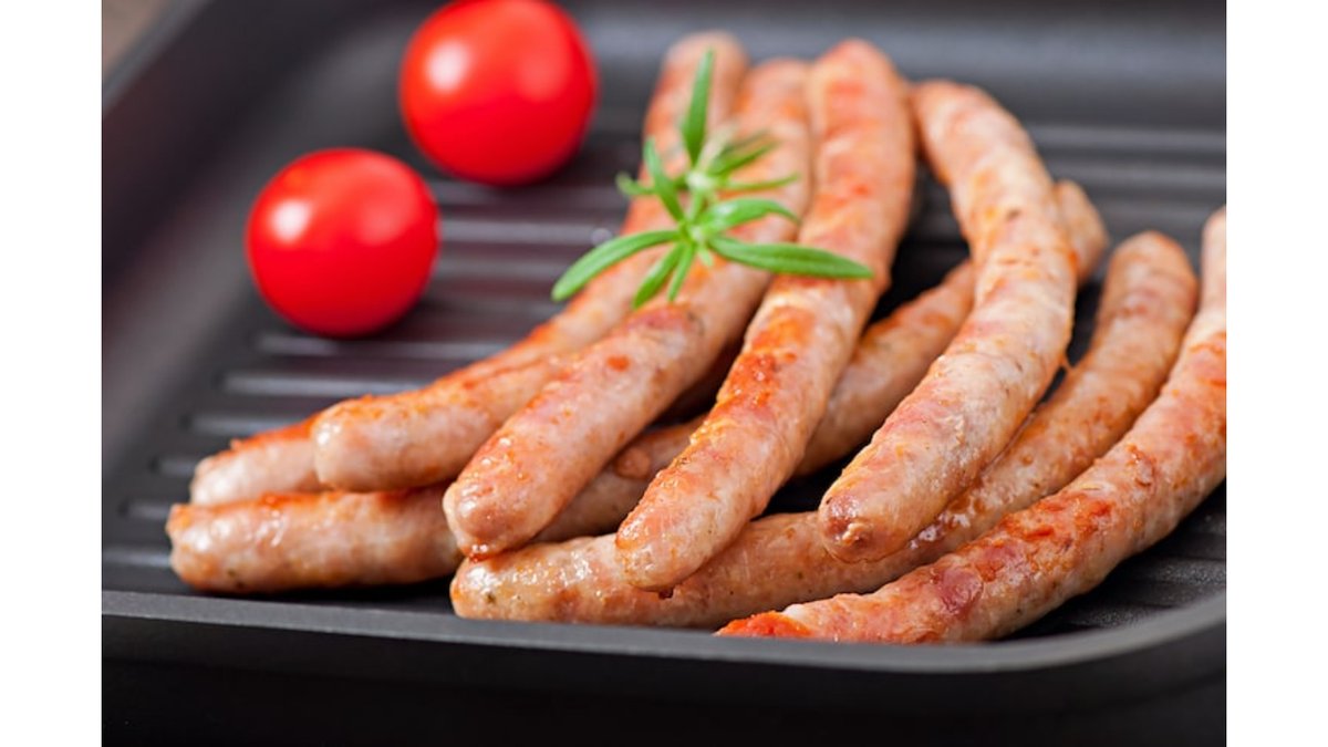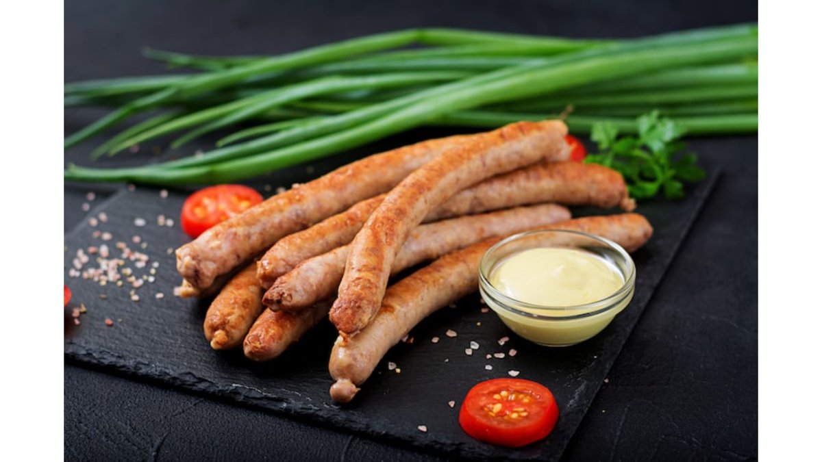 Chicken sausages (500g) with fries, vegetables, and sour cream & garlic sauce