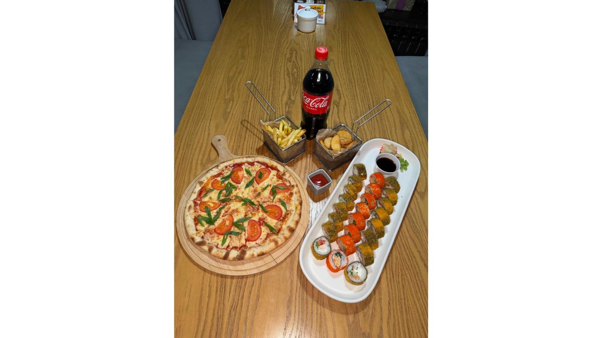 Pepperoni, California, Creamy with eel, Sake Tempura, Margherita, Fries, Nuggets, Wedges, Cola, Beef sandwich, Chicken 5 pcs