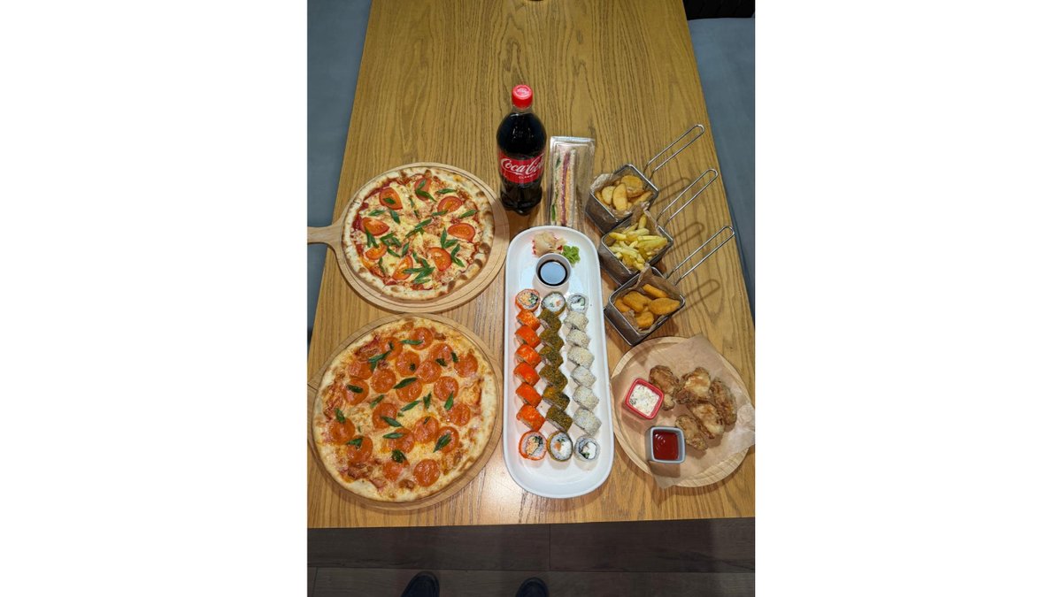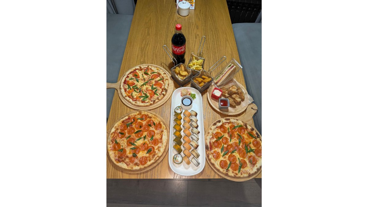 Pepperoni 2 pcs, Margherita, Philadelphia, Canada, America Tempura, Fries, Cola, Wedges, Nuggets, Beef sandwich, Chicken 5 pcs