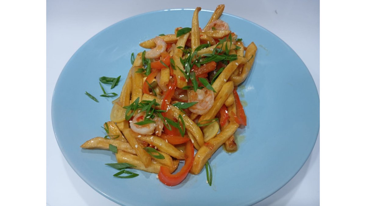 Fries, carrot, zucchini, green beans, bell pepper, onion, shrimps, salmon, sweet & sour sauce