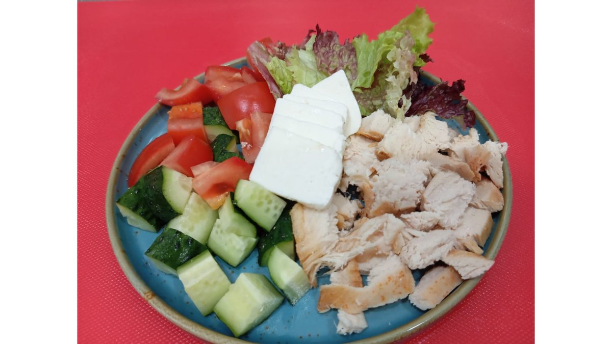 Chicken fillet, tomatoes, cucumbers, mixed salad, bryndza cheese, herbs