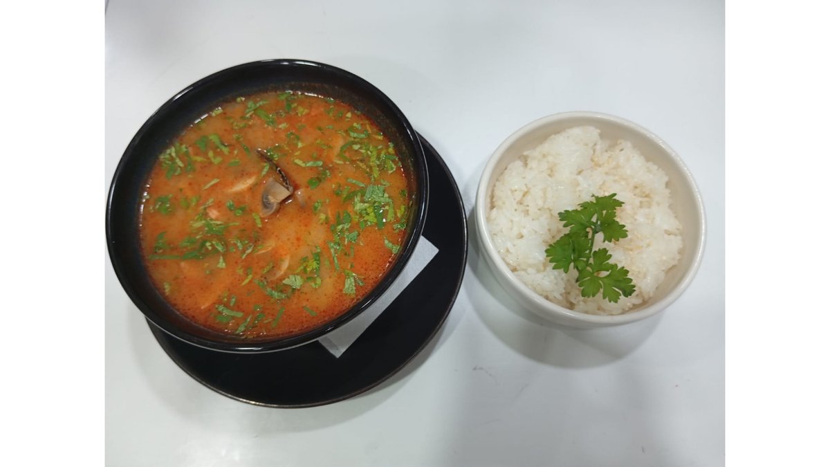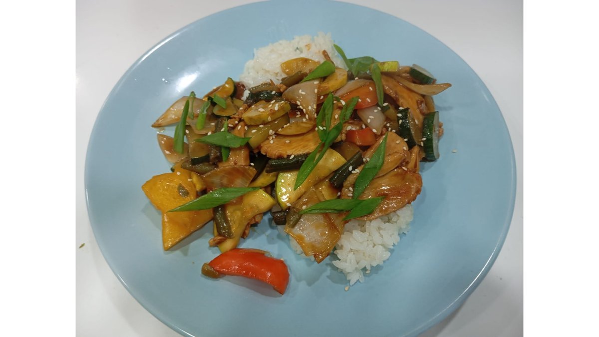 Rice, carrot, zucchini, green beans, bell pepper, onion, chicken fillet, udon sauce