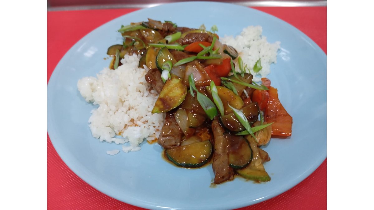 Rice, carrot, zucchini, green beans, bell pepper, onion, beef, udon sauce