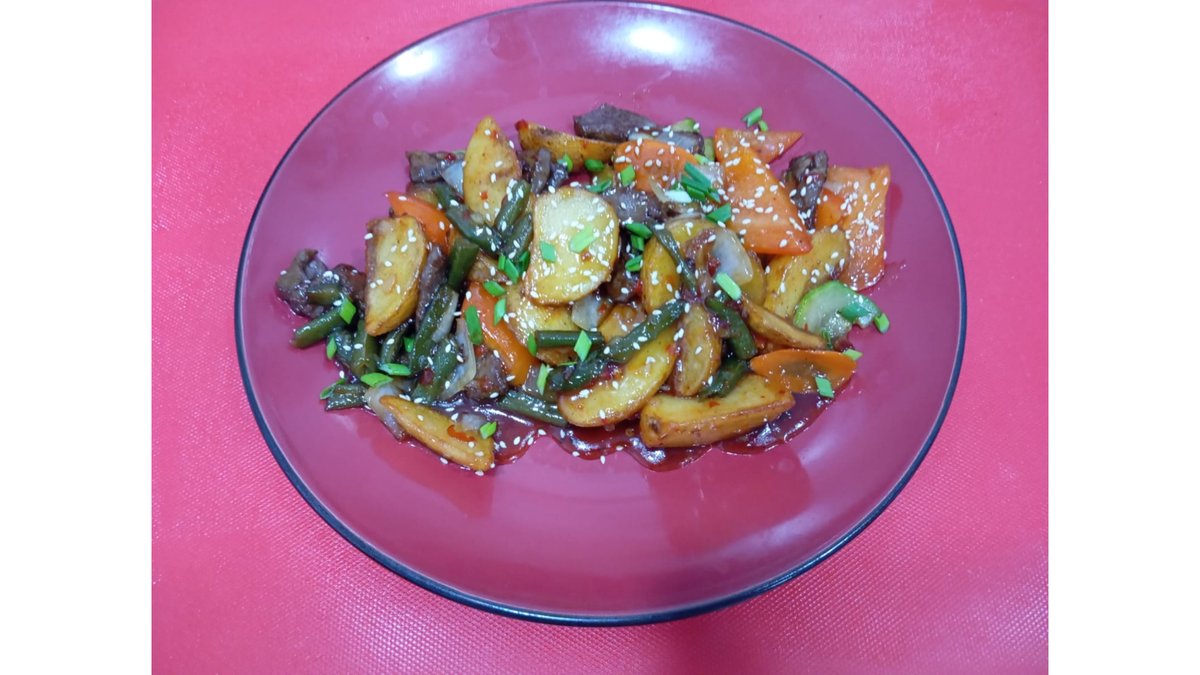 Wedges, carrot, zucchini, green beans, bell pepper, onion, beef, sweet & sour sauce