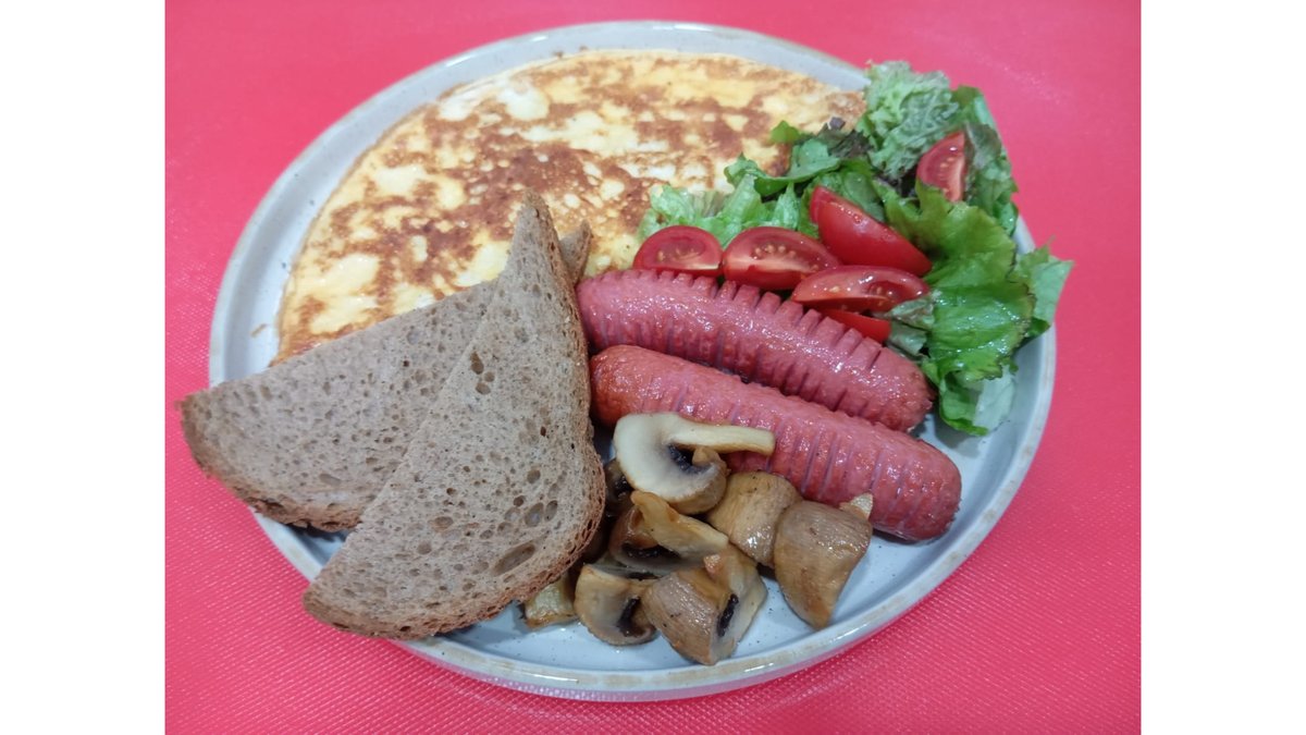 3-egg omelet, beef sausages, mixed salad, black bread, cherry tomatoes, mushrooms