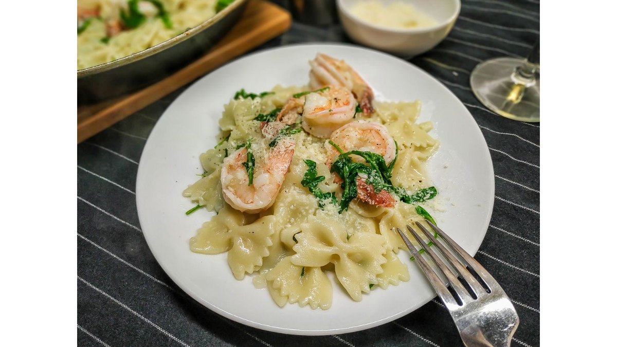 Farfalle, tiger shrimps, onion, cherry tomatoes, mushrooms, cream, parmesan