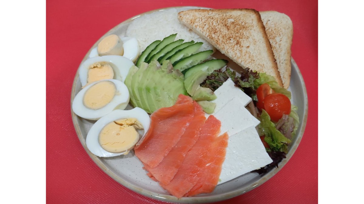 Toast, boiled egg, cherry tomatoes, avocado, cucumbers, mixed salad, lightly salted salmon, boiled rice