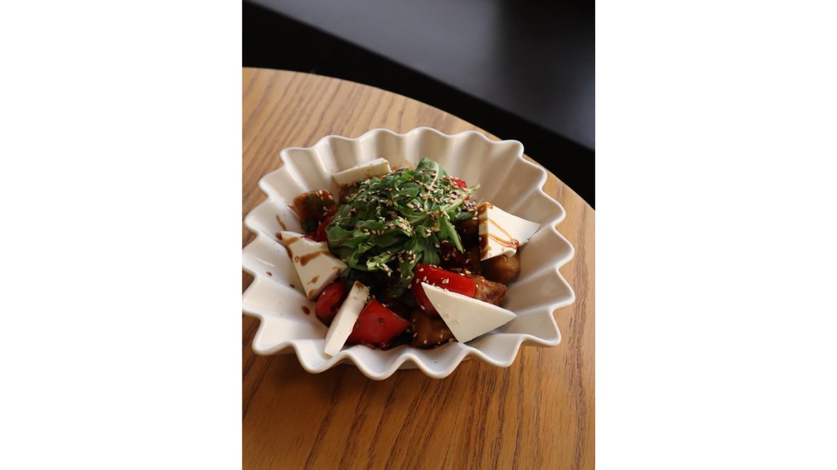 Eggplant, arugula, cherry tomatoes, cream cheese, sweet & sour sauce, unagi, sesame